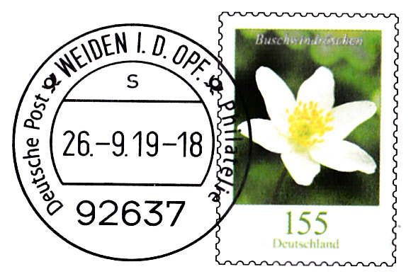 Umschlag im Format 229x162 mm mit einem Wertstempel mit der 145 Cent Marke "Buschwindröschen" (MiNr 3472) aus der Dauerserie "Blumen" mit aufgedruckter Zähnung und Vorausentwertung "Deutsche Post (Posthorn) WEIDEN I.D.OPF (Posthorn) Philatelie/ s / 26.-9.19-18".