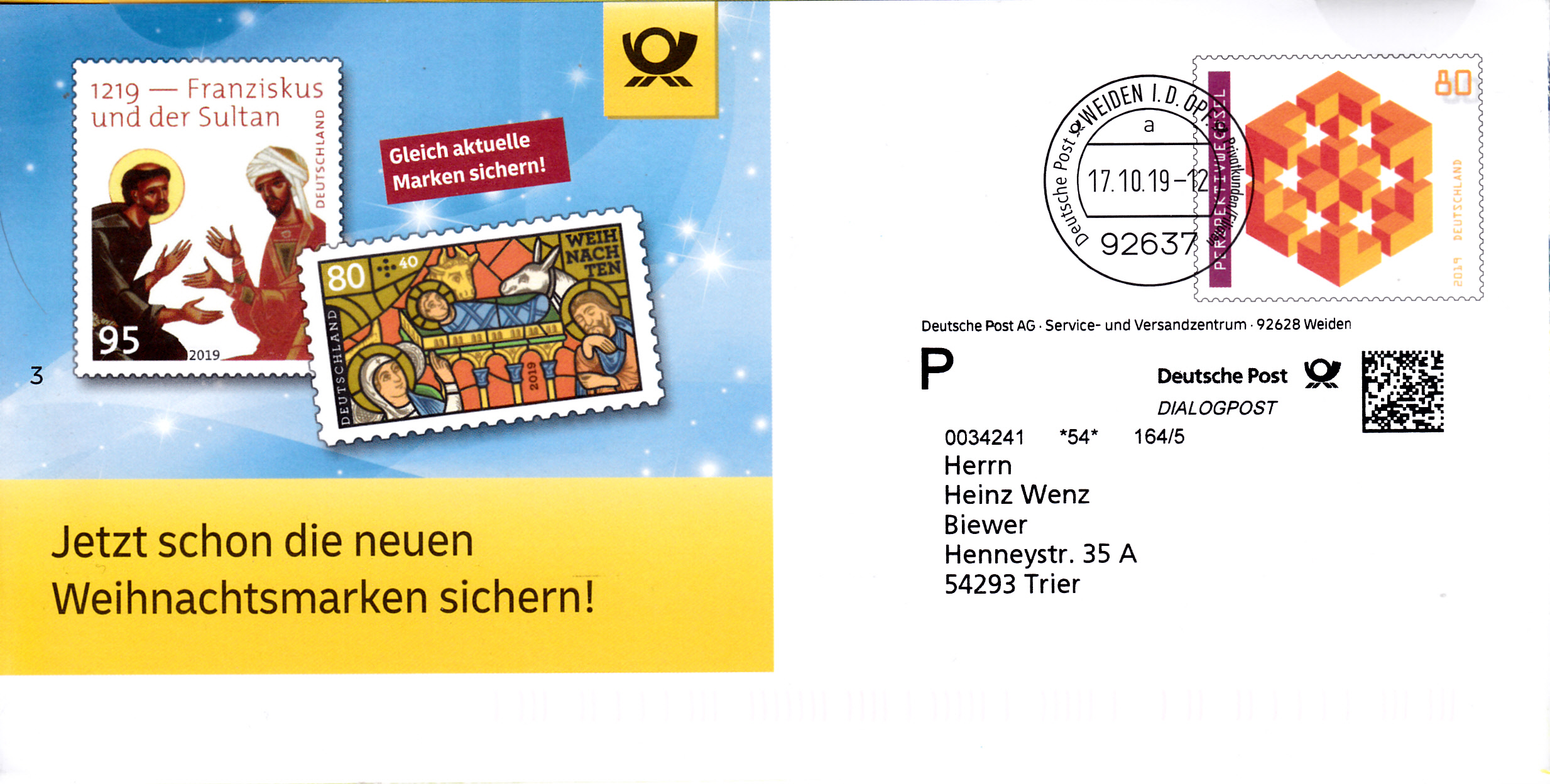 Faltbrief 210 mm x 102 mm mit Wertstempel der 80C-Marke aus der Serie "Optische Täuschungen" (MiNr 3497) mit dem Motiv "Perspektivwechsel" aufgedruckter Zähnung und Vorausentwertung "Deutsche Post (Posthorn) WEIDEN I.D.OPF (Posthorn) Privatkunden/Filialen / a / 17.10.19-12".