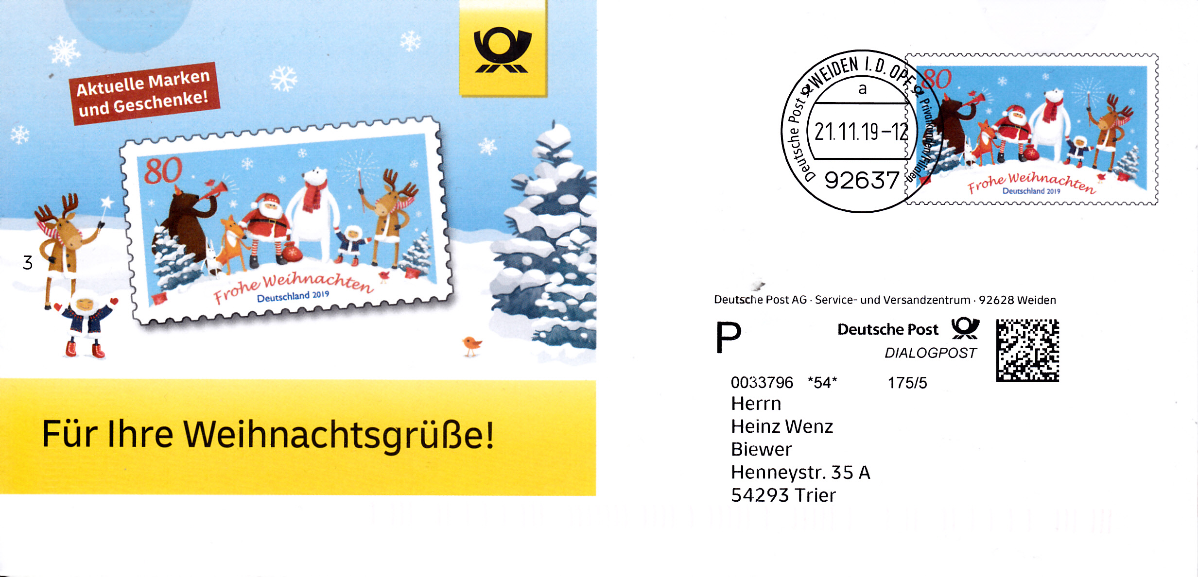 Faltbrief 210 mm x 102 mm mit Wertstempel der 80C-Marke "Weihnachten mit Freunden" (MiNr 3504) mit aufgedruckter Zähnung und Vorausentwertung "Deutsche Post (Posthorn) WEIDEN I.D.OPF (Posthorn) Privatkunden/Filialen / a / 21.11.19-12".