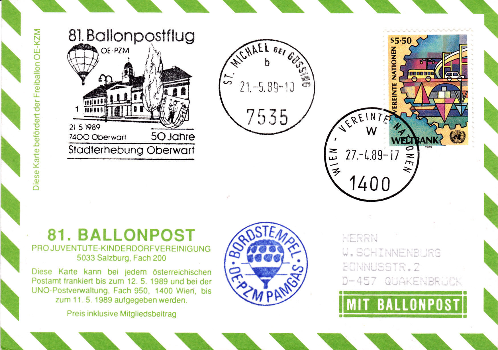 Diese Karte wurde am 27.4.1989 für den 81. Ballonpostflug der Österreichischen Pro Juventute mit dem Freiballon OE-KZM in Wien beim UNO-Postamt aufgegeben. Die zur Frankatur verwendete Marke der UNO-Postverwaltung Wien wurde mit einem Tagesstempel Wien - Vereinte Nationen gestempelt. Am 21.5.1989 erhielt der Brief den Sonderstempel aus Salzburg mit der Kennziffer "2" zu diesem 81. Ballonpostflug. Zusätzlich wurde ein Tagesstempel aus St. Michael bei Güssing und ein Bordstempel auf dem Brief angebracht.