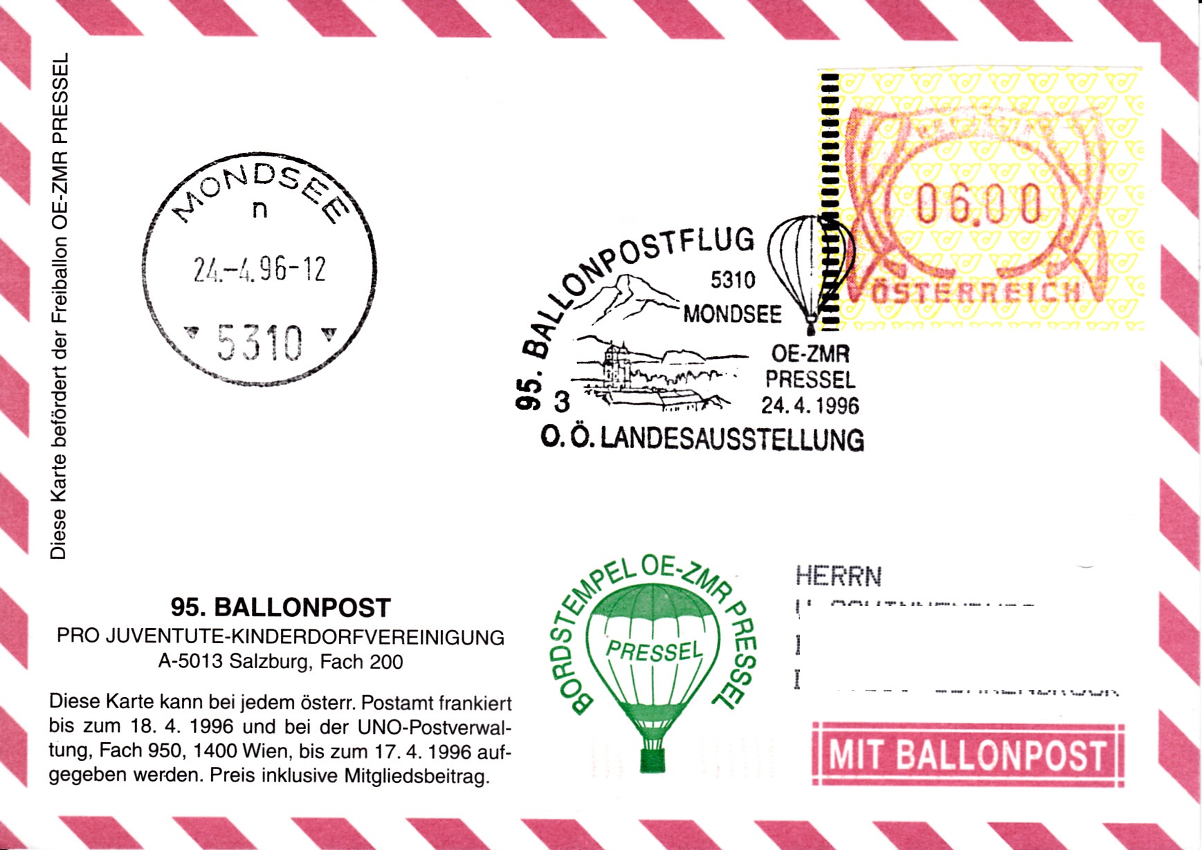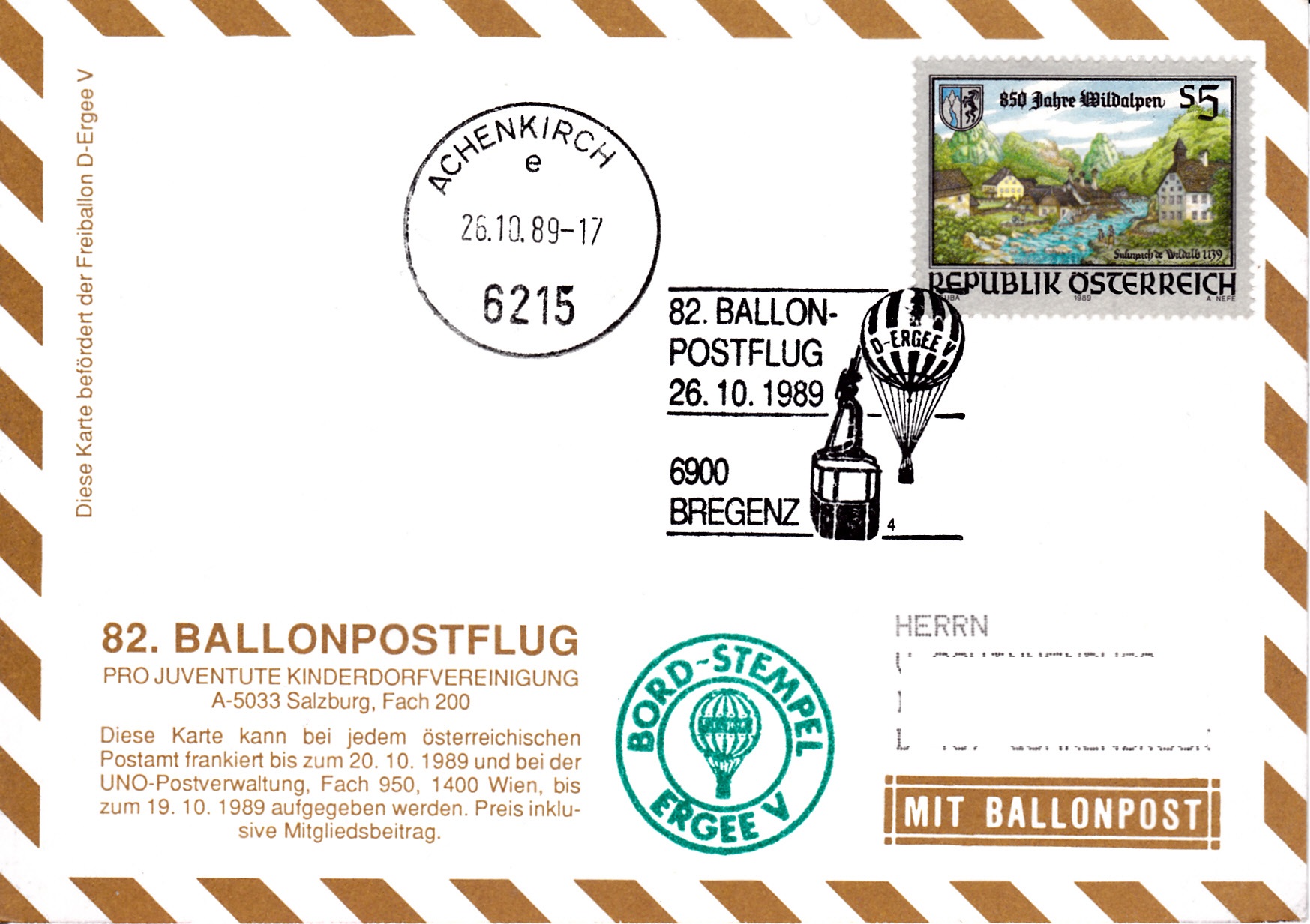 Diese Karte wurde am 22.3.1991 in Salzburg für den 85.Ballonpostflug der Österreichischen Pro Juventute mit dem Freiballon OE-DZC aufgegeben. Er erhielt den Sonderstempel mit der Kennziffer "3" aus Salzburg zu diesem Ballonflug und wurde am gleichen Tag mit dem Freiballon OE-DZC befördert. Der Brief erhielt noch einen Stempel "Ersttag", einen Tagesstempel St. Pantaleon, Oberösterreich und einen Bordstempel.