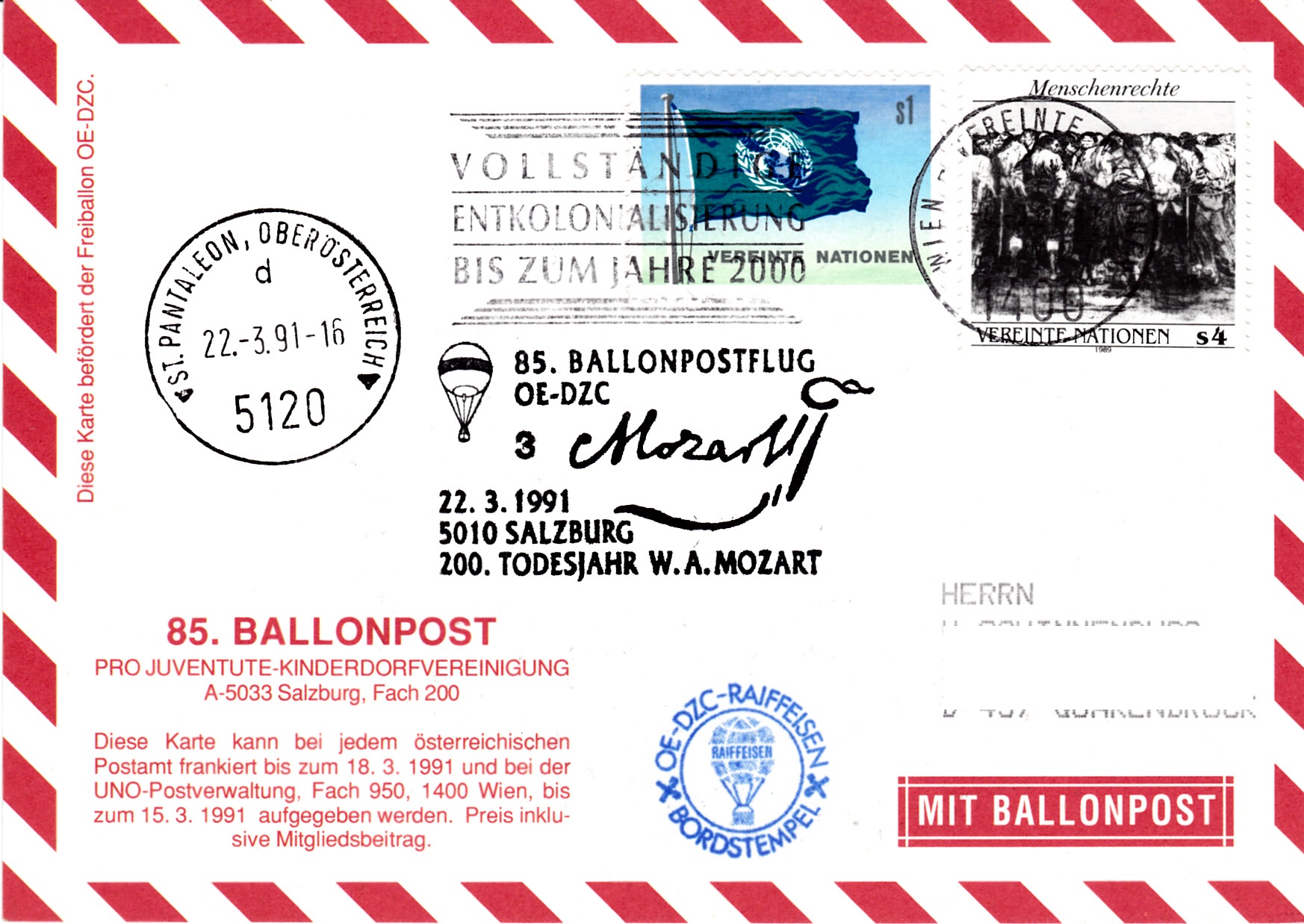 Diese Karte wurde am 4.3.1991 für den 85. Ballonpostflug der Österreichischen Pro Juventute mit dem Freiballon OE-DZC in Wien beim UNO-Postamt aufgegeben. Die zur Frankatur verwendeten Marken der UNO-Postverwaltung Wien wurden mit einem Maschinenstempel Wien - Vereinte Nationen gestempelt. Am 22.3.1991 erhielt der Brief den Sonderstempel aus Salzburg mit der Kennziffer "3" zu diesem 85. Ballonpostflug. Zusätzlich wurde ein Tagesstempel aus St. Pantaleon, Oberösterreich und ein Bordstempel auf dem Brief angebracht.