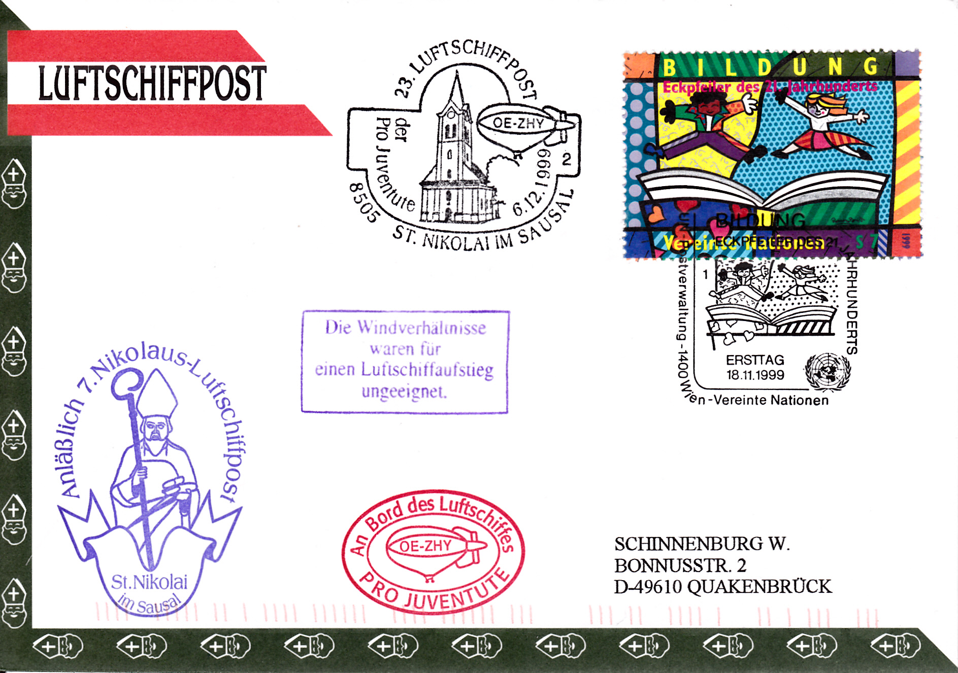 Dieser Brief wurde am 18.11.1999 beim Postamt der UN-Postverwaltung Wien für die 23. Luftschiffpost der Pro Juventute mit dem Luftschiff OE-ZHY aufgegeben. Die Marke wurde mit dem dazu gehörenden Erstagsonderstempel der UN-Postverwaltung gestempelt. Am 6.12.1999 erhielt der Brief den Sonderstempel aus St. Nikolai im Sausal mit der Kennziffer "2" zur 23. Luftschiffpost. Da der Start wegen schlechter Windverhältnisse nicht stattfand, erhielt der Brief noch einen "Ausfallstempel" und einen Bordstempel.