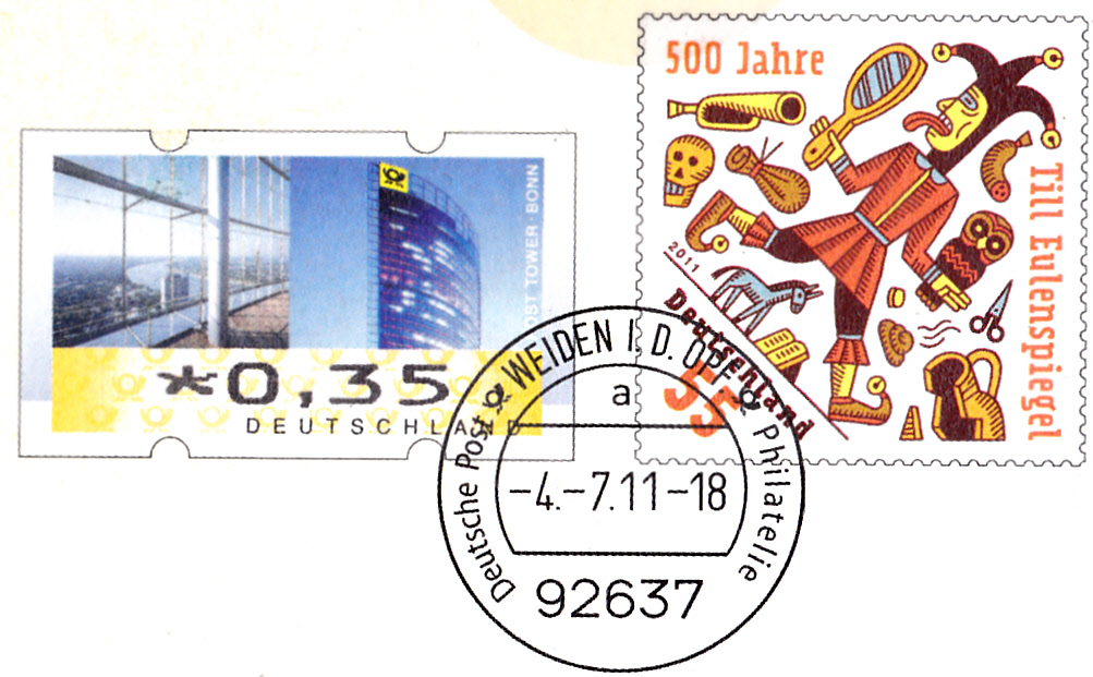 Faltbrief 235 mm x 125 mm (MiuNr EA B96 02) mit den Wertstempel einer Automatenmarke "Post Tower" zu 35 Cent und einem Wertstempel der 55 Cent-Marke "500 Jahre Till Eulenspiegel" (MiNr 2880) mit aufgedruckter Zähnung und Vorausentwertung "Deutsche Post (Posthorn) WEIDEN I.D.OPF (Posthorn) Privatkunden/Philatelie / a / -4.-6.17-12". Die Verwendung des Wertstempel erfolgte bereits vor der Ausgabe der Marke am 7.7.2011.