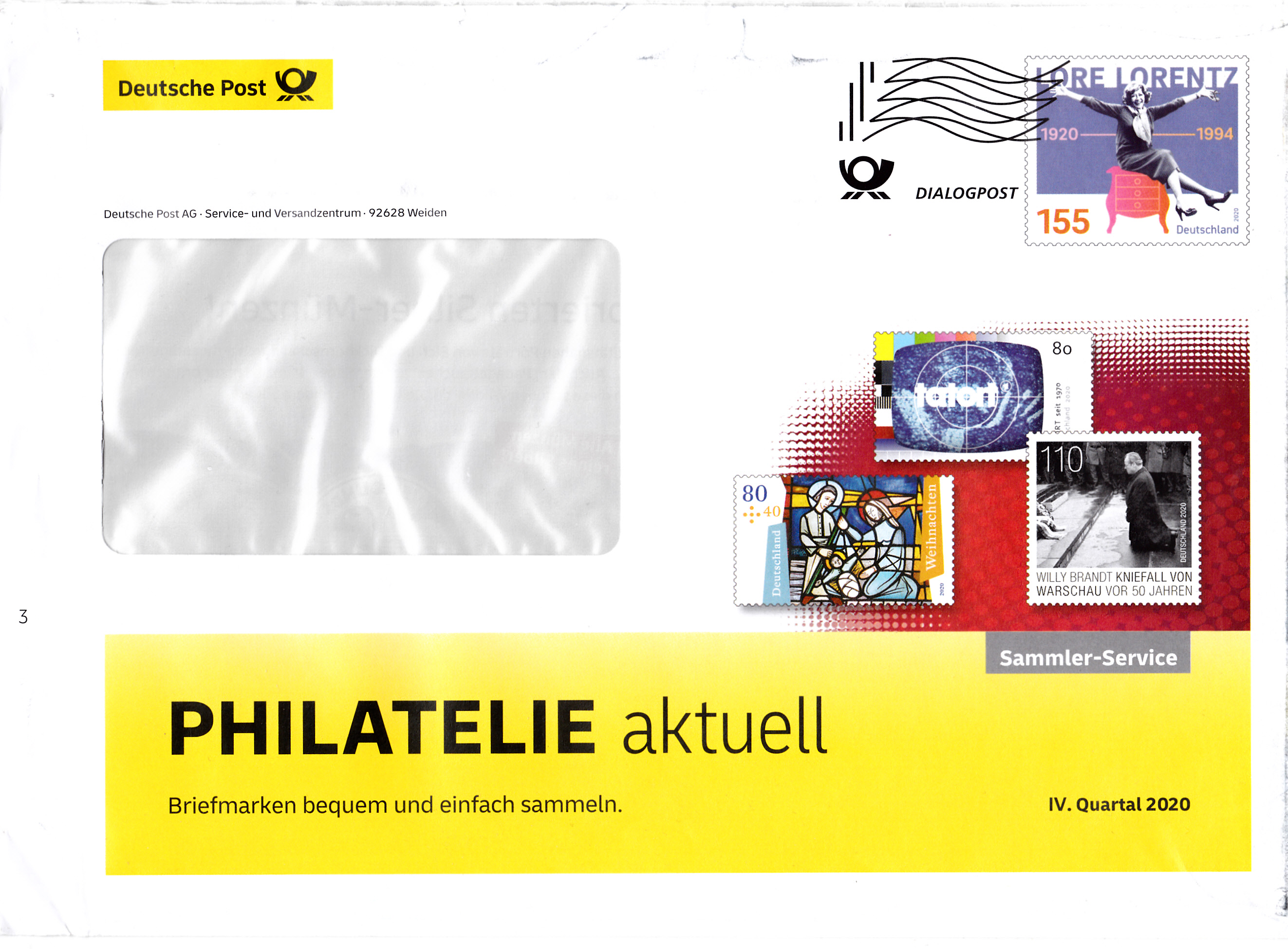 Umschlag im Format 229x162 mm mit einem Wertstempel mit der 155 Cent Marke (MiNr 3529) mit dem Motiv "100. Geburtstag von Lore Lorentz" mit aufgedruckter Zähnung. Der Wertstempel ist mit einer Welle "Dialogpost" entwertet.