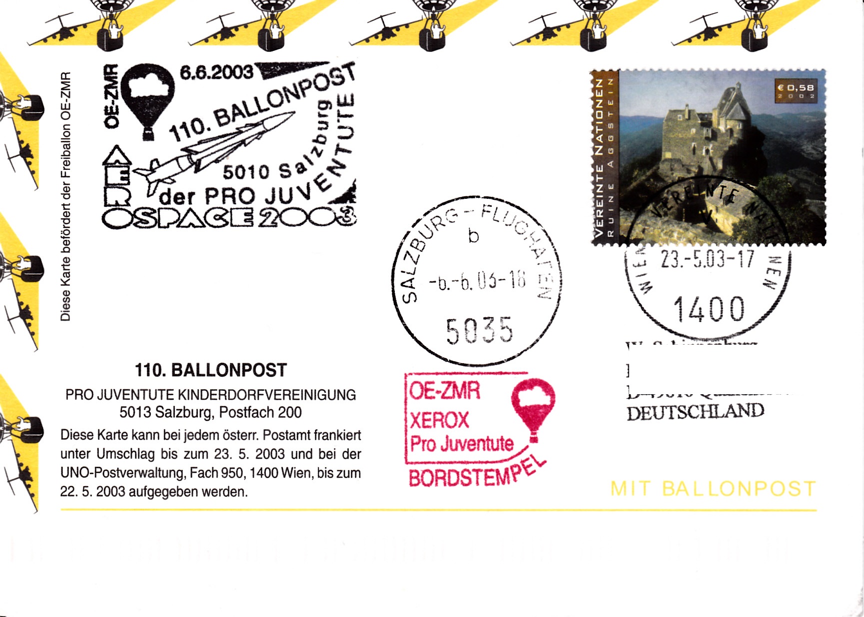 Diese Karte wurde am 6.6.2003 in Salzburg für den 110. Ballonpostflug der Österreichischen Pro Juventute mit dem Freiballon OE-ZMR aufgegeben. Sie erhielt den Sonderstempel aus Salzburg zu diesem Ballonflug und wurde am gleichen Tag mit dem Freiballon OE-ZMR befördert. Sie erhielt zusätzlich einen Tagesstempel Salzburg Flughafen und einen Bordstempel.