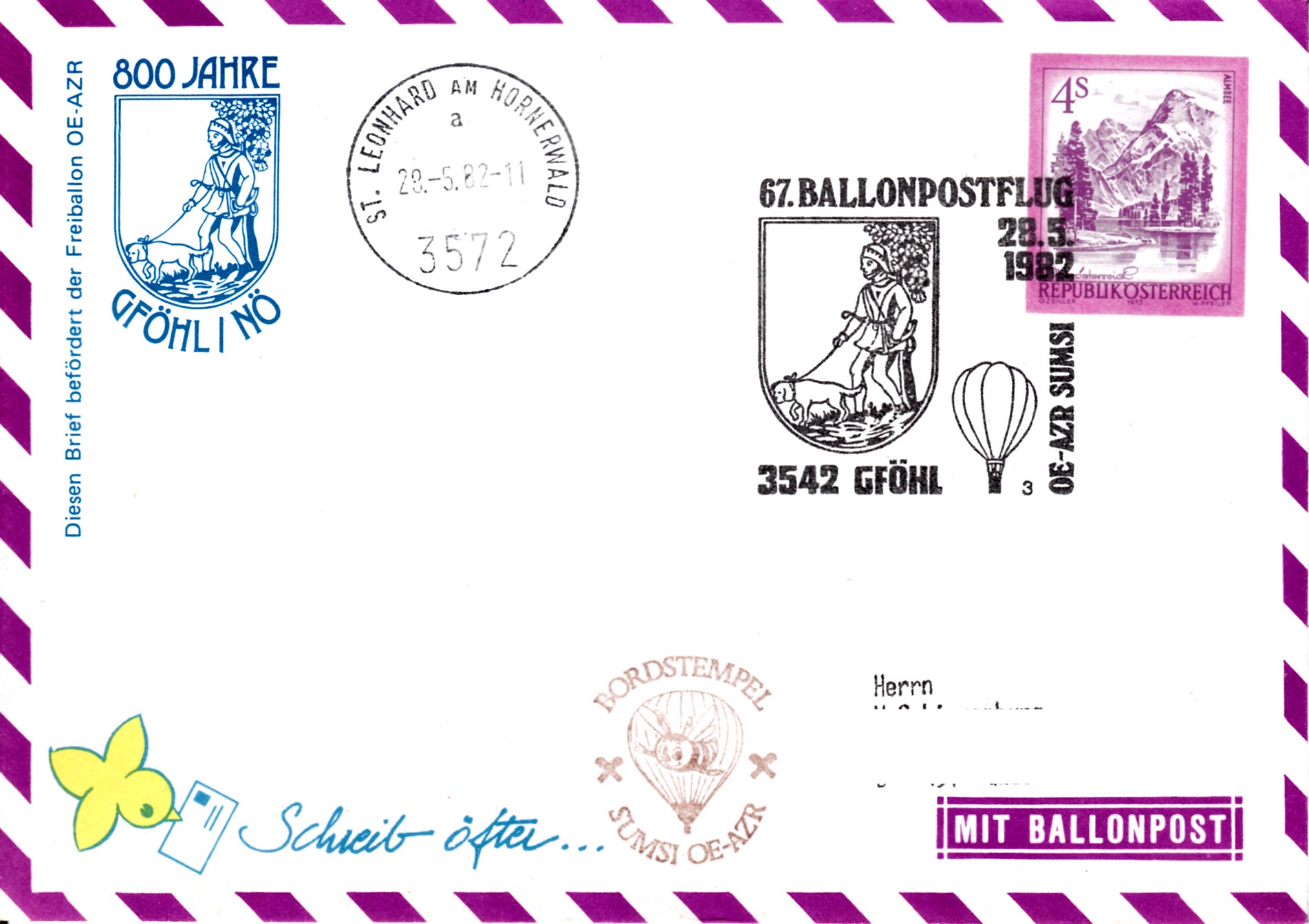 Dieser Ganzsachenumschlag wurde am 28.5.1982 in Gföhl für den 67. Ballonpostflug der Österreichischen Pro Juventute mit dem Freiballon OE-AZR SUMSI aufgegeben. Er erhielt den Sonderstempel mit der Kennziffer "3" aus Gföhl zu diesem Ballonflug und wurde am gleichen Tag mit dem Freiballon OE-AZR SUMSI befördert. Er erhielt zusätzlich einen Tagesstempel St. Leonhard am Hornerwald mit dem Kennbuchstaben "a" und einen Bordstempel.