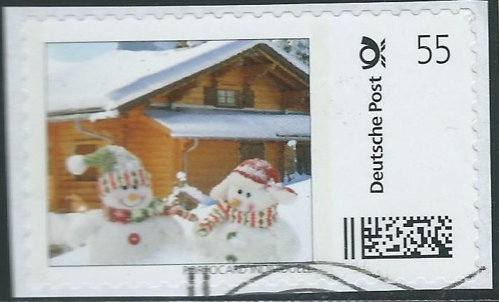 Aber trotzdem nochein kleiner Nachschlag: Marke Individuell aus einer Portocard mit Motiv Schneemann und Schneefrau zu 55 ct mit Grossbriefentwertung, diese leider nur am Rand ohne erkennbares Datum.