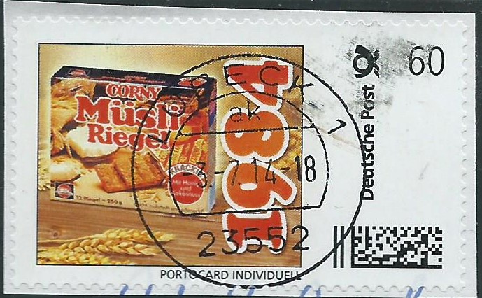 60 ct Marke mit Werbung für Corny-Müssli-Riegel, gestempelt 3.7.14 in Lübeck 1
