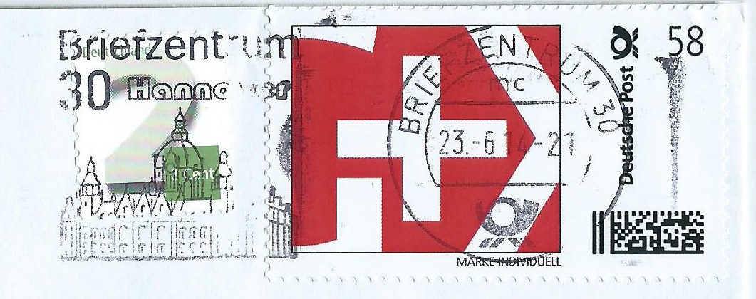 Der erste Ausschnitt mit der 58 ct-Marke und der 2 ct Zusatzfrankatur ist gestempelt am 23.6.14 im Briefzentrum 30, der zweite mit 58 und 90 ct ist leider mit Tintenstrahlentwertung für Grossbriefe entwertet und kaum zu entziffern, nur BZ 30 lässt sich noch erahnen.