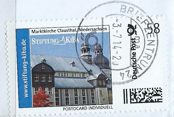 Nun folgt eine 58 ct-Marke mit Motiv Marktkirche Claustal, Niedersachsen. Gestempelt im Briefzentrum 24 am 3.7.14