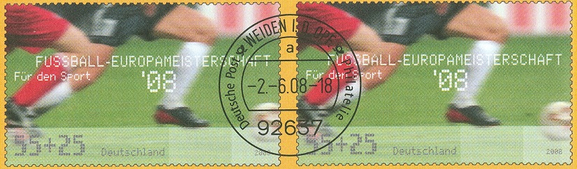 Die EA F 323 erinnert an die Fußball-Europameisterschaft 2008. Mit seinem Juni-Vorausentwertungsdatum "-2.-6.08 - 18" stimmt der Ganzsachenumschlag auf kommende warme Tage und Nächte ein.