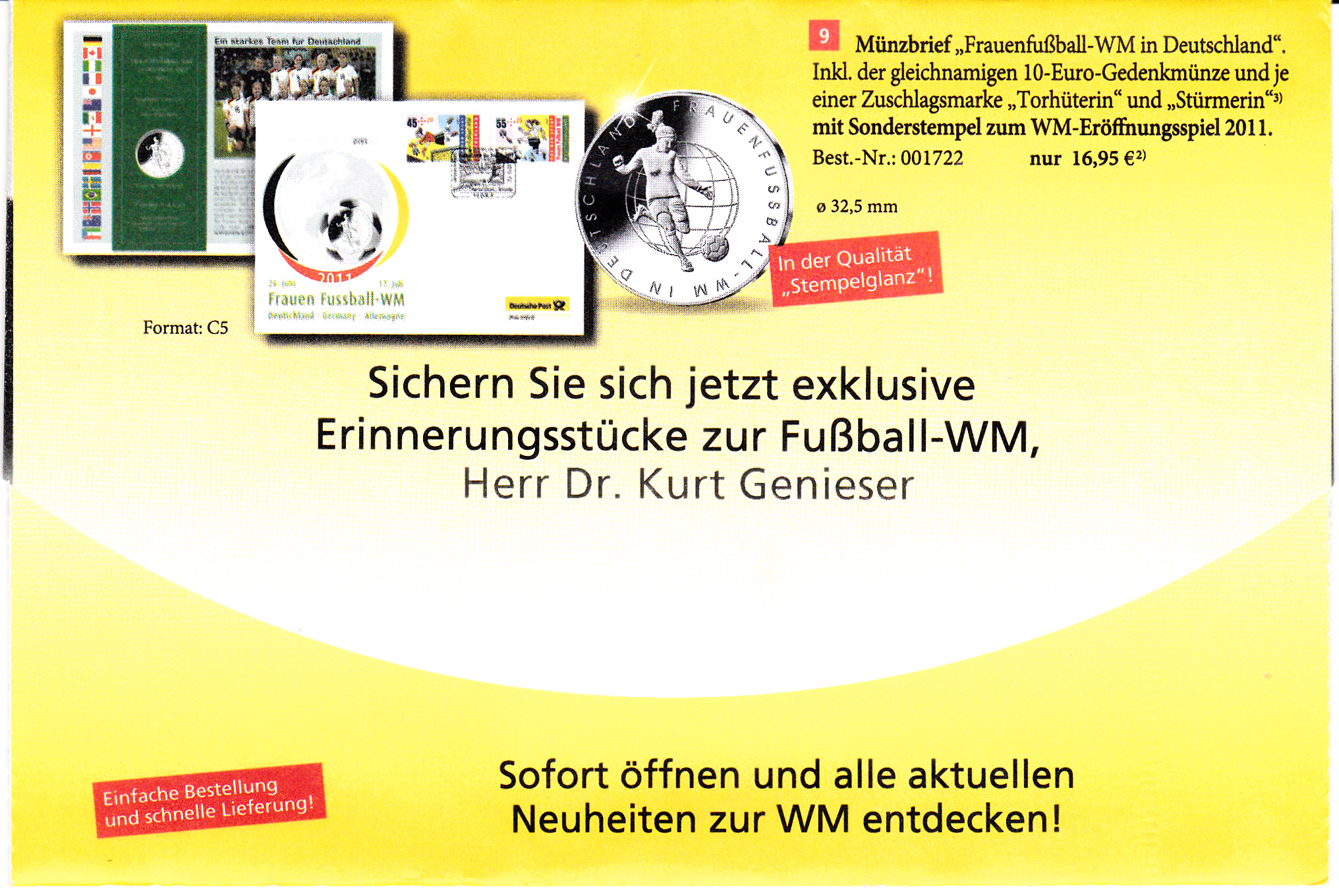 Unter den Eigenausgaben der DP AG mit Postlogo "Deutsche Post Philatelie" wird auch dieses Falzblatt mit dem Wertstempel zu 55+25 Cent aus der Sportserie 2011 zur Frauen-Fußball WM (MiNr 2858) mit der MiNr EA F545 im Ganzsachen-Katalog aufgeführt. Die Vorausentwertung wurde mit dem Datum 20.-6.11-18 vorgenommen.
