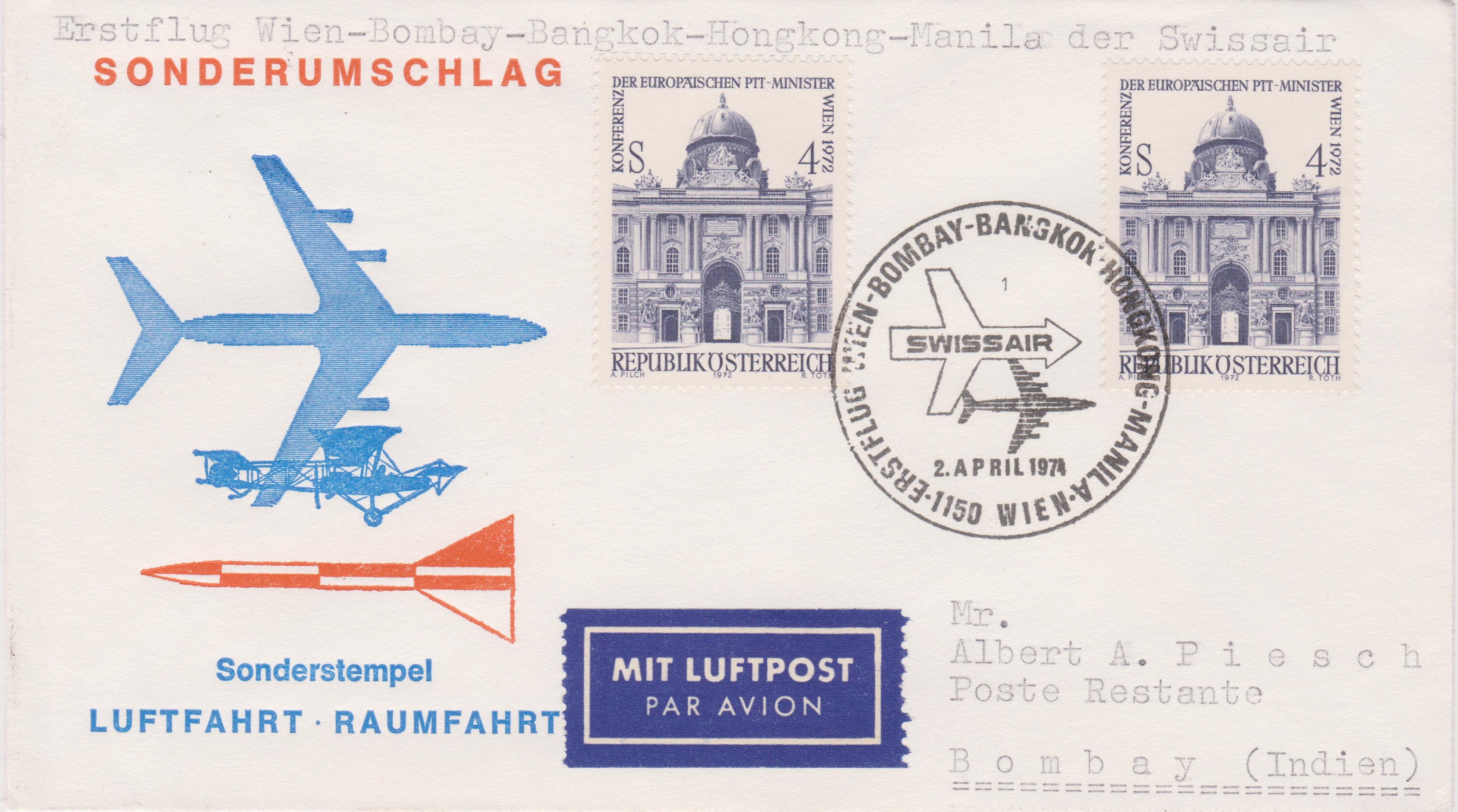 Dieser Beleg wurde am 02.04.1974 auf dem Erstflug der SWISSAIR "WIEN-BOMBAY" befördert mit einer "McDonnell Douglas DC-8":