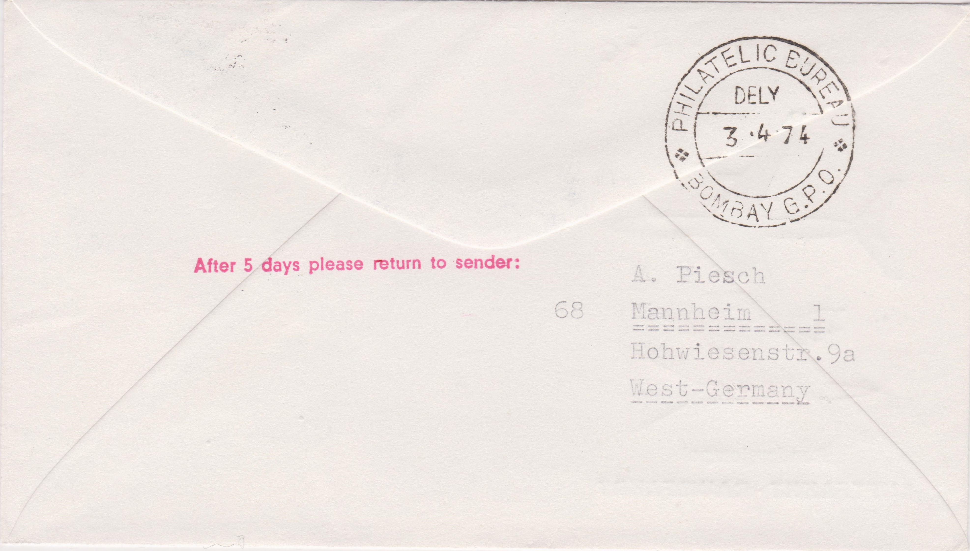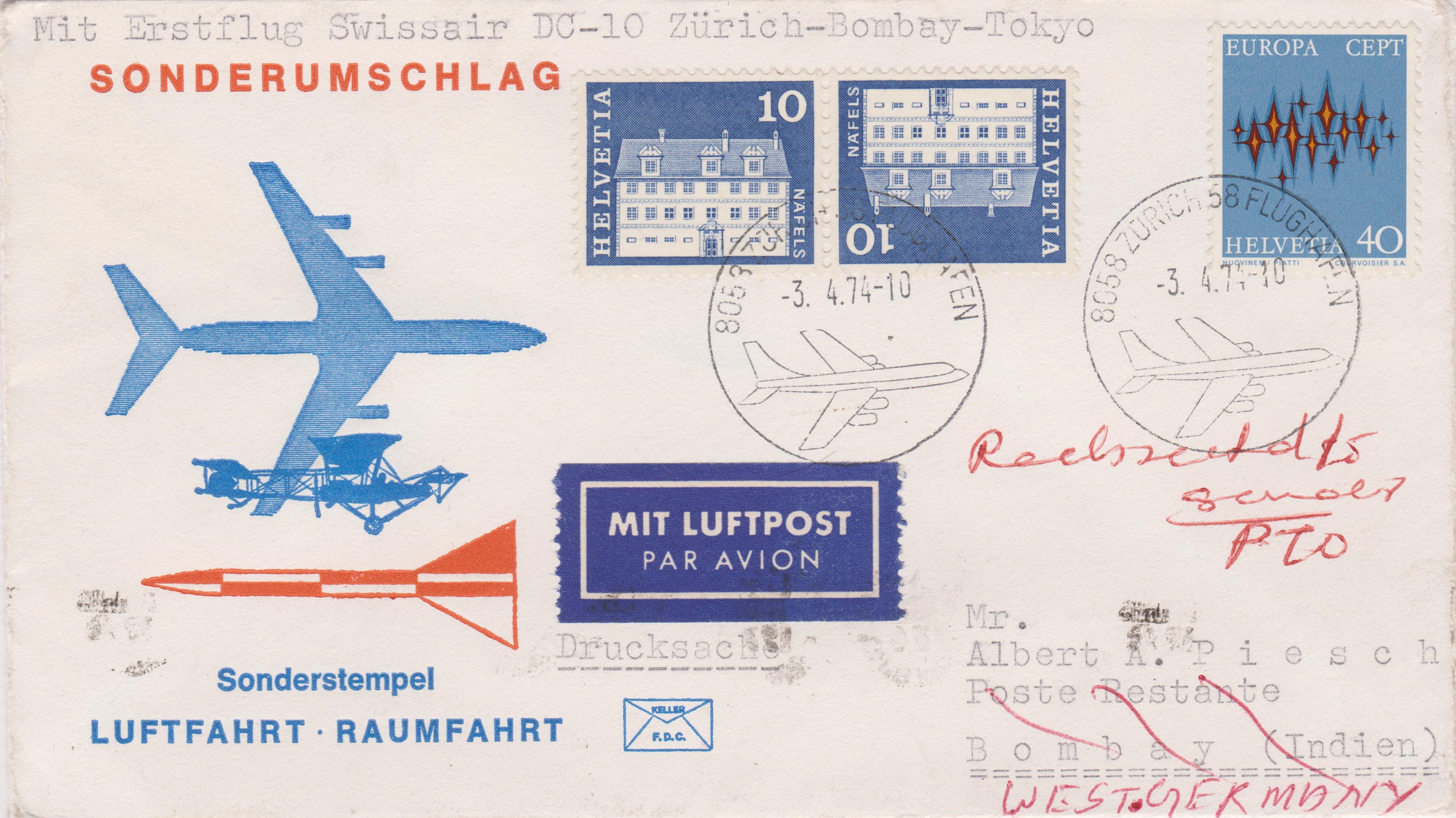 Dieser Beleg wurde am 03.04.1974 auf dem Erstflug der SWISSAIR "ZÜRICH-BOMBAY" befördert mit einer "McDonnell Douglas DC-10":