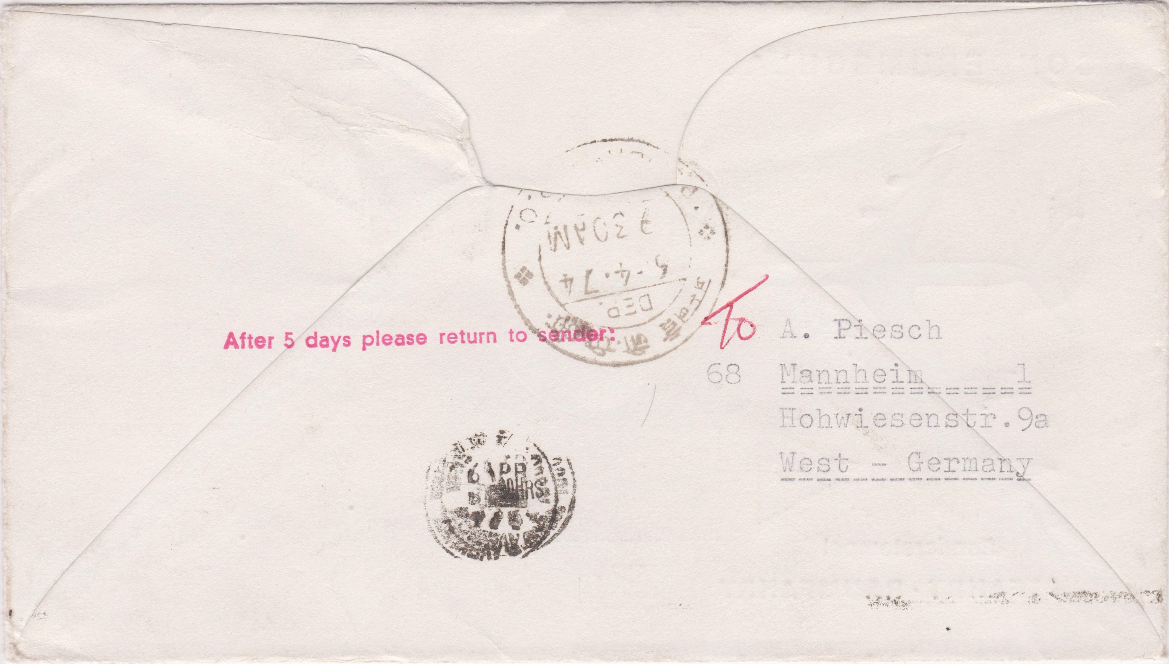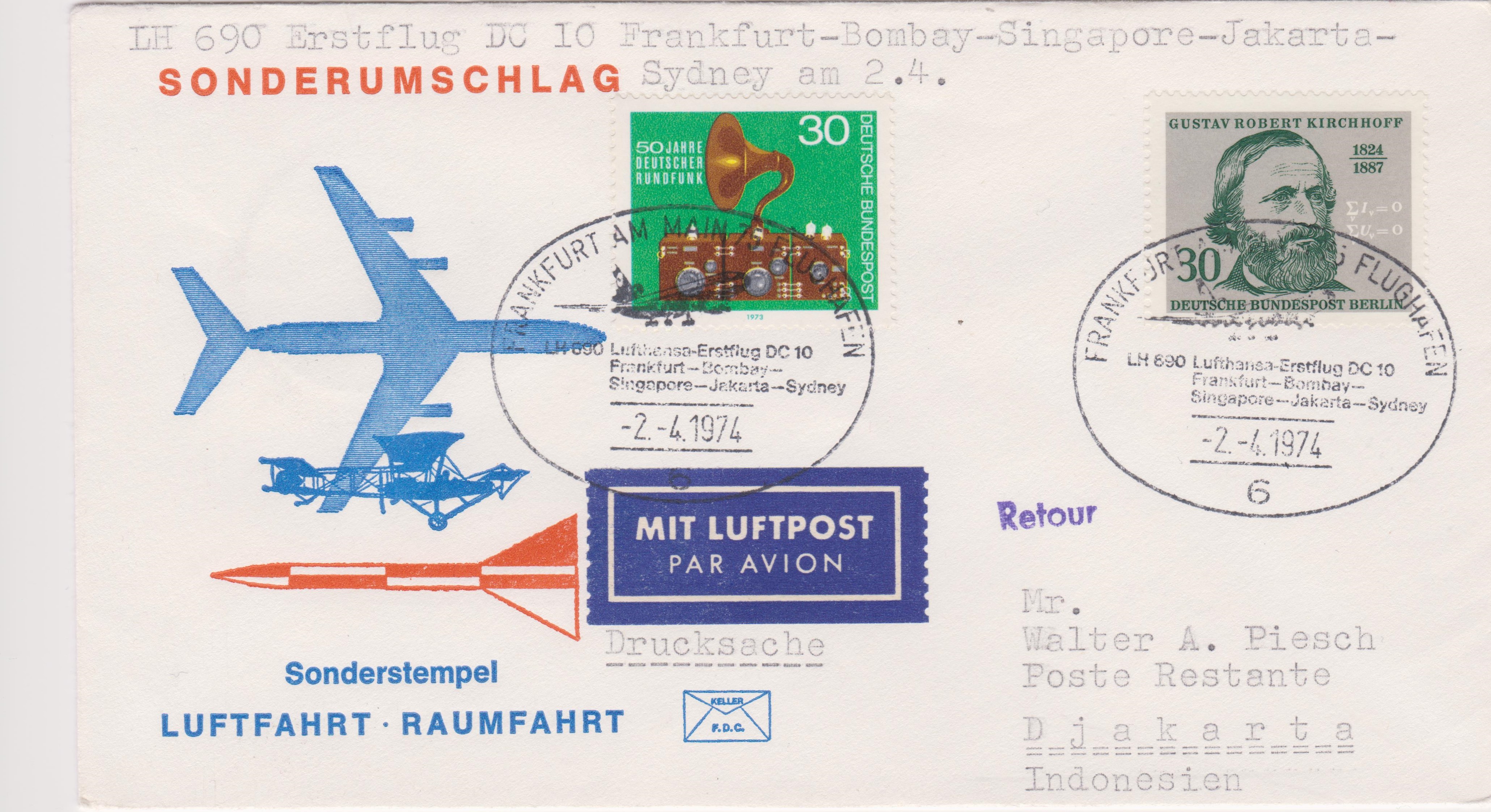 Dieser Beleg wurde am 02.04.1974 mit einer McDonnell Douglas DC-10 auf dem Lufthansa-Erstflug LH 690 "Frankfurt-Bombay-Singapore-Jakarta" befördert:
