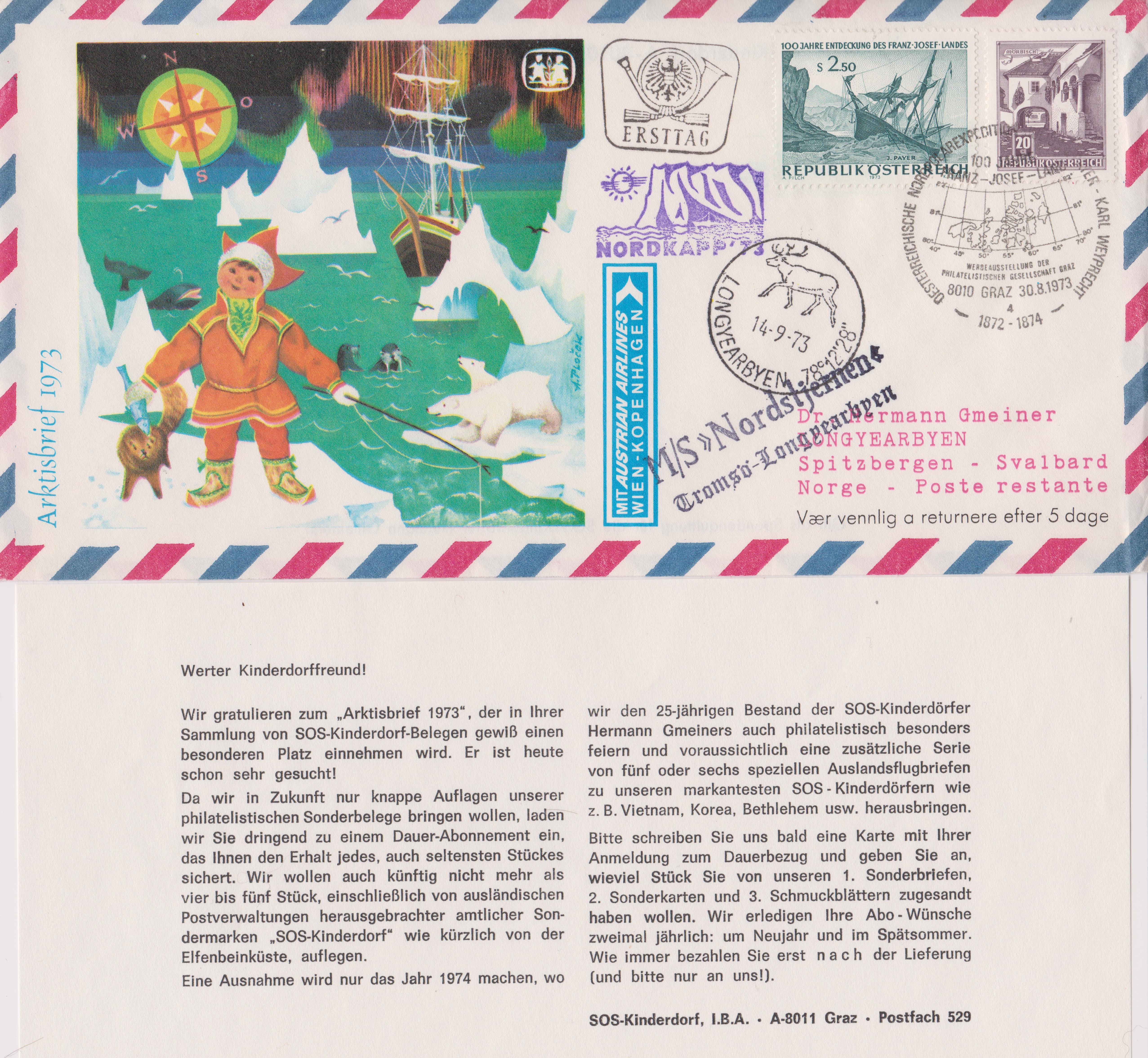 "Arktisbrief 1973", aufgegeben als Ersttagsbrief am 30.08.1973 in Wien, befördert mit "AUSTRIAN AIRLINES WIEN-KOPENHAGEN" sowie mit MS Nordstjernen von Tromsö an seinen Bestimmungsort Longyearbyen: