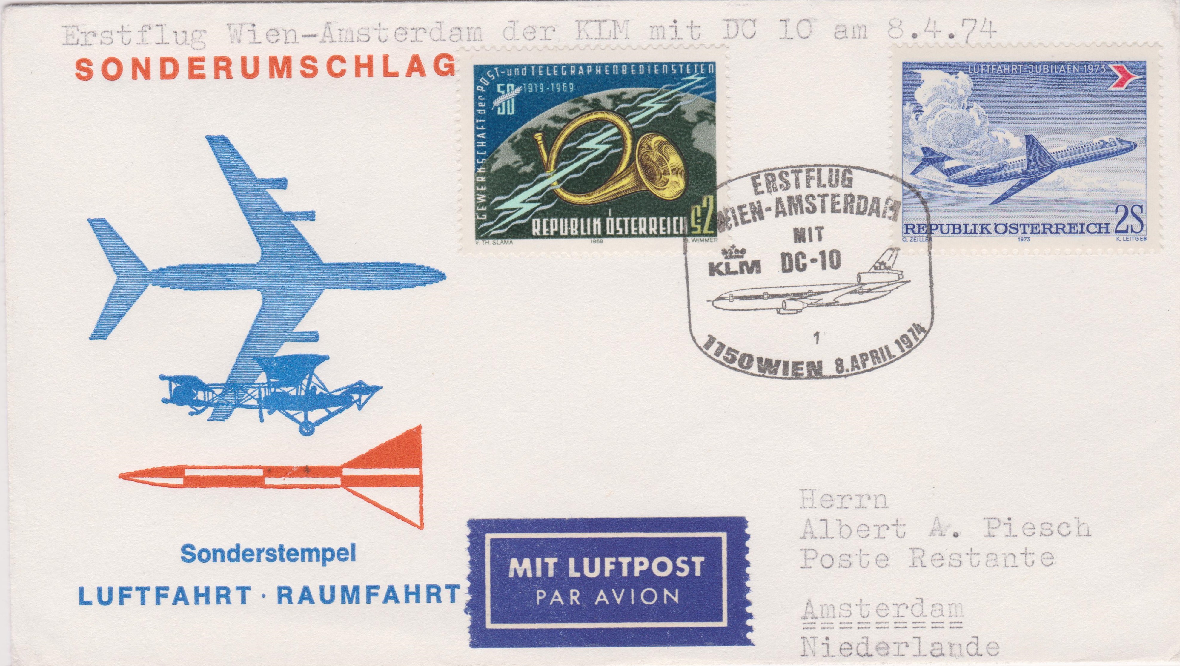 Dieser Beleg wurde am 08.04.1974 auf dem Erstflug der KLM "Wien-Amsterdam" befördert mit einer "McDonnell Douglas DC-10":