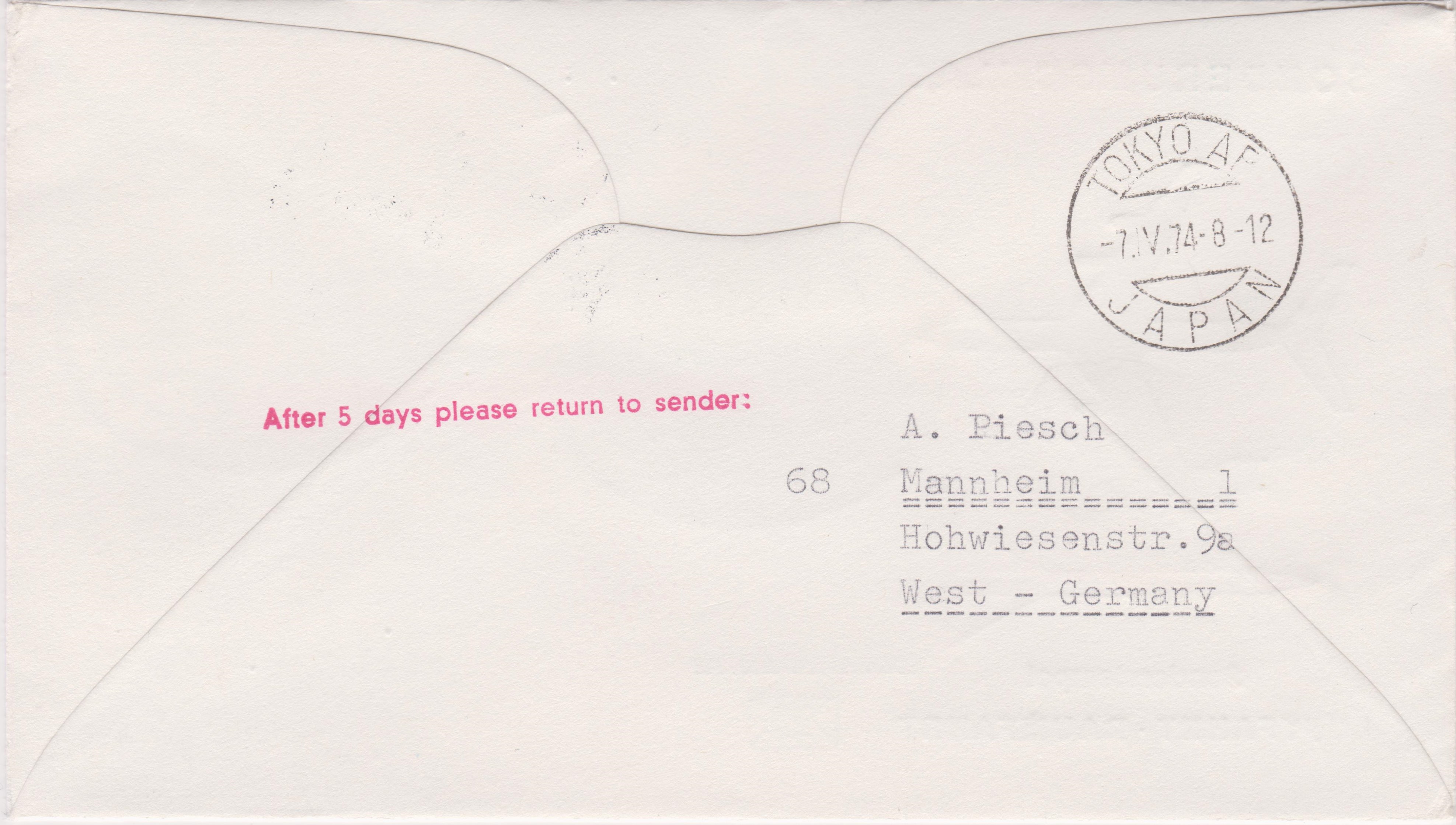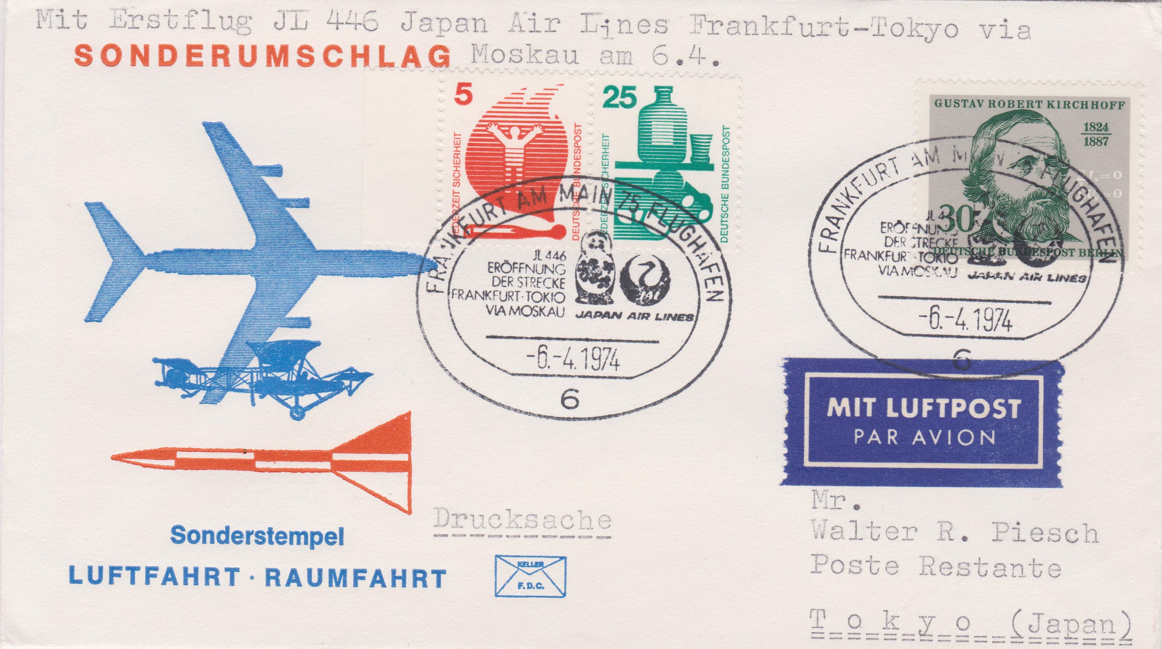 Dieser Beleg dokumentiert den Erstflug JL 446 von JAPAN AIR LINES am 06.04.1974 auf der Strecke "FRANKFURT AM MAIN NACH TOKIO VIA MOSKAU":