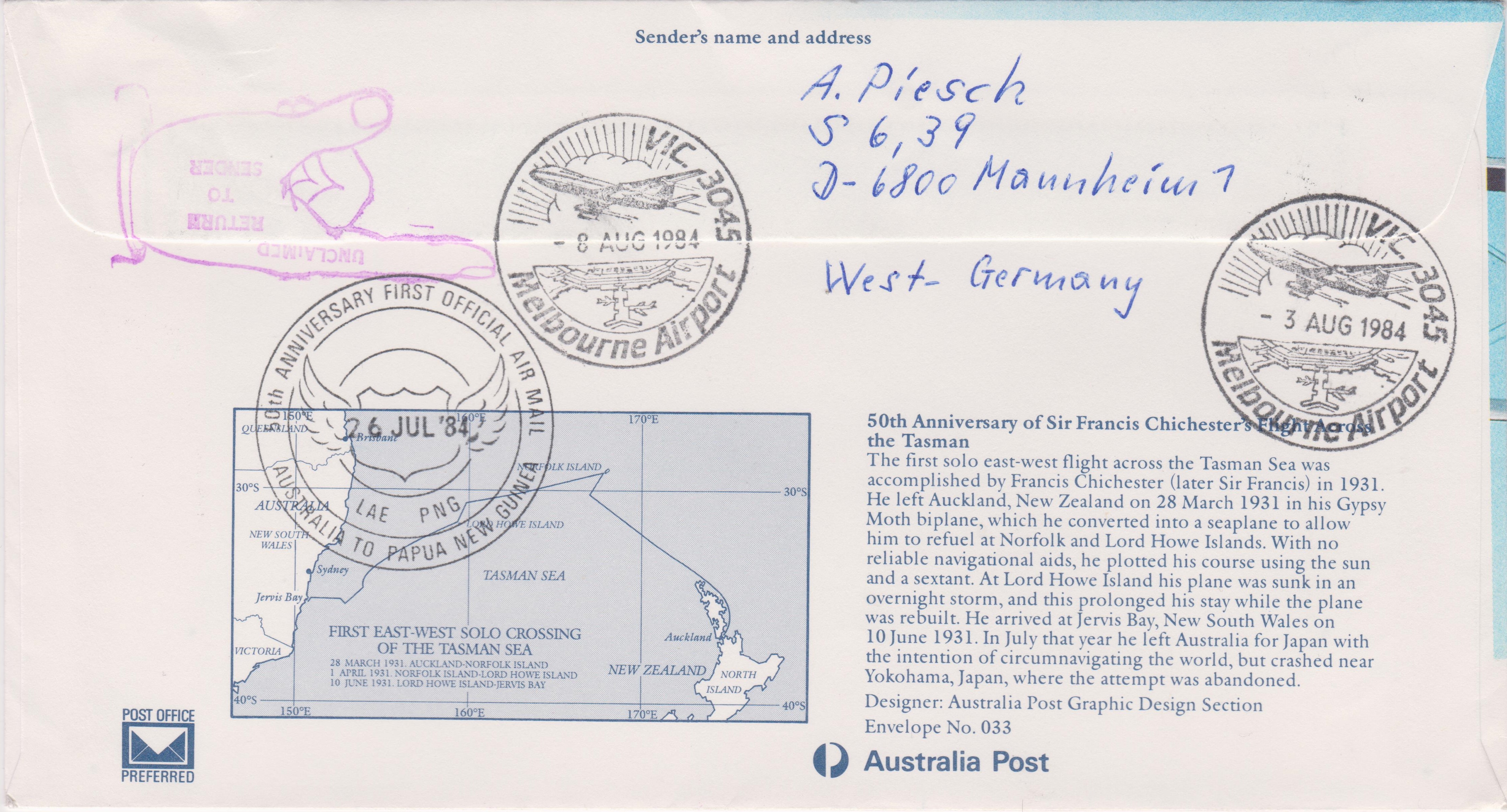 Dieser Beleg dokumentierte 1984 das 50-jährigen Jubiläum der ersten offiziellen Luftpostbeförderung durch Sir Francis Chichester´s Flug von MELBOURNE, Australien, nach LAE, Papua-Neuguinea: