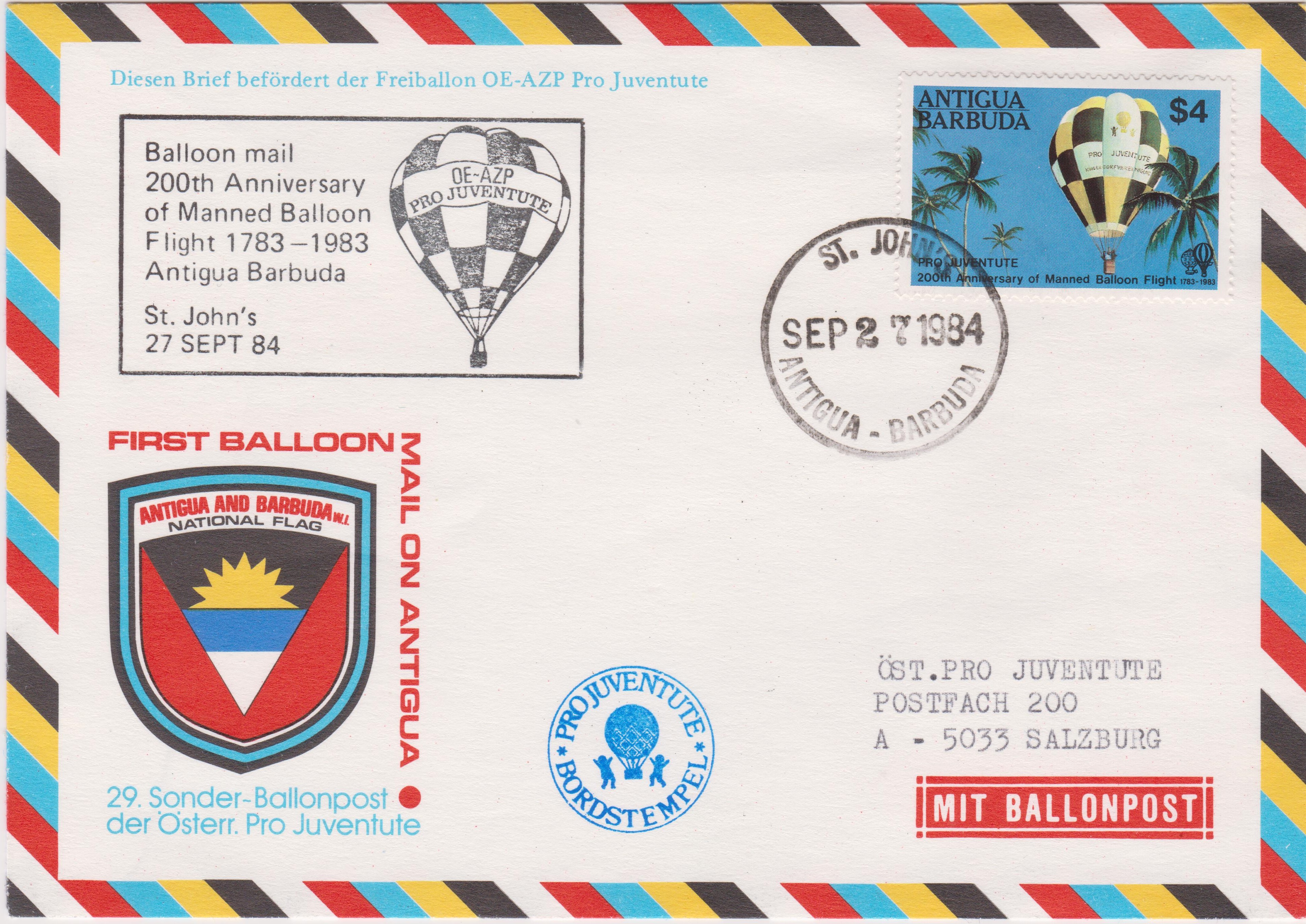 Die erste Ballonpost auf Antigua fand statt am 27.9.1984 in St. John's (Antigua und Barbuda) als 29. Sonder-Ballonpostbeförderung der Österreichischen Pro Juventute mit dem Freiballon OE-AZP Pro Juventute , der auch auf dem Postwertzeichen, Antigua und Barbuda MiNr. 740, abgebildet wurde: