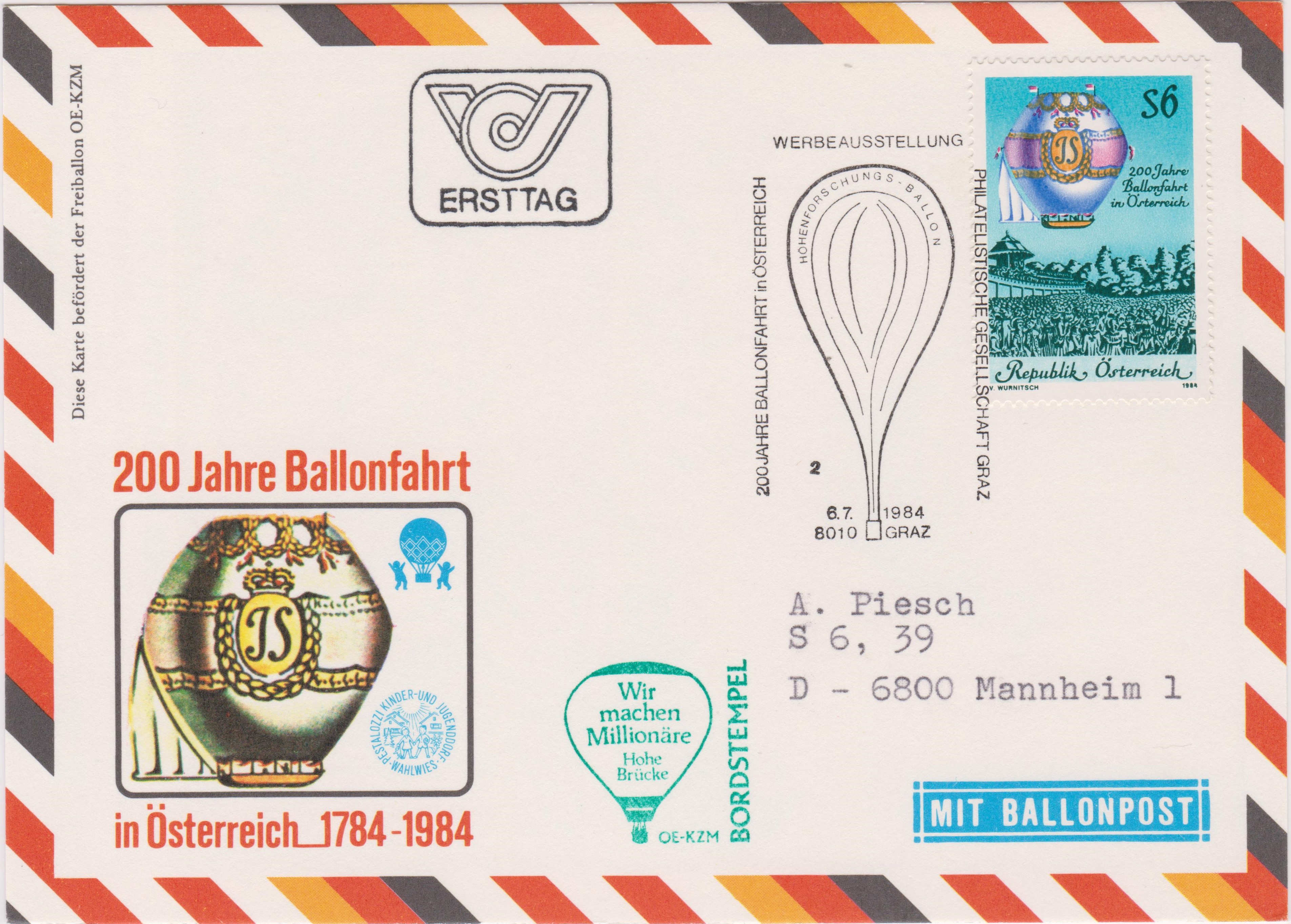 Diese Postkarte wurde am 06.07.1984 als "ERSTTAG" des österreichischen Postwertzeichens "200 Jahre Ballonpost in Österreich" als "28. SONDER-BALLONPOSTFLUG" mit dem Freiballon "OE-KZM" befördert, was ein "BORDSTEMPEL" dokumentiert: