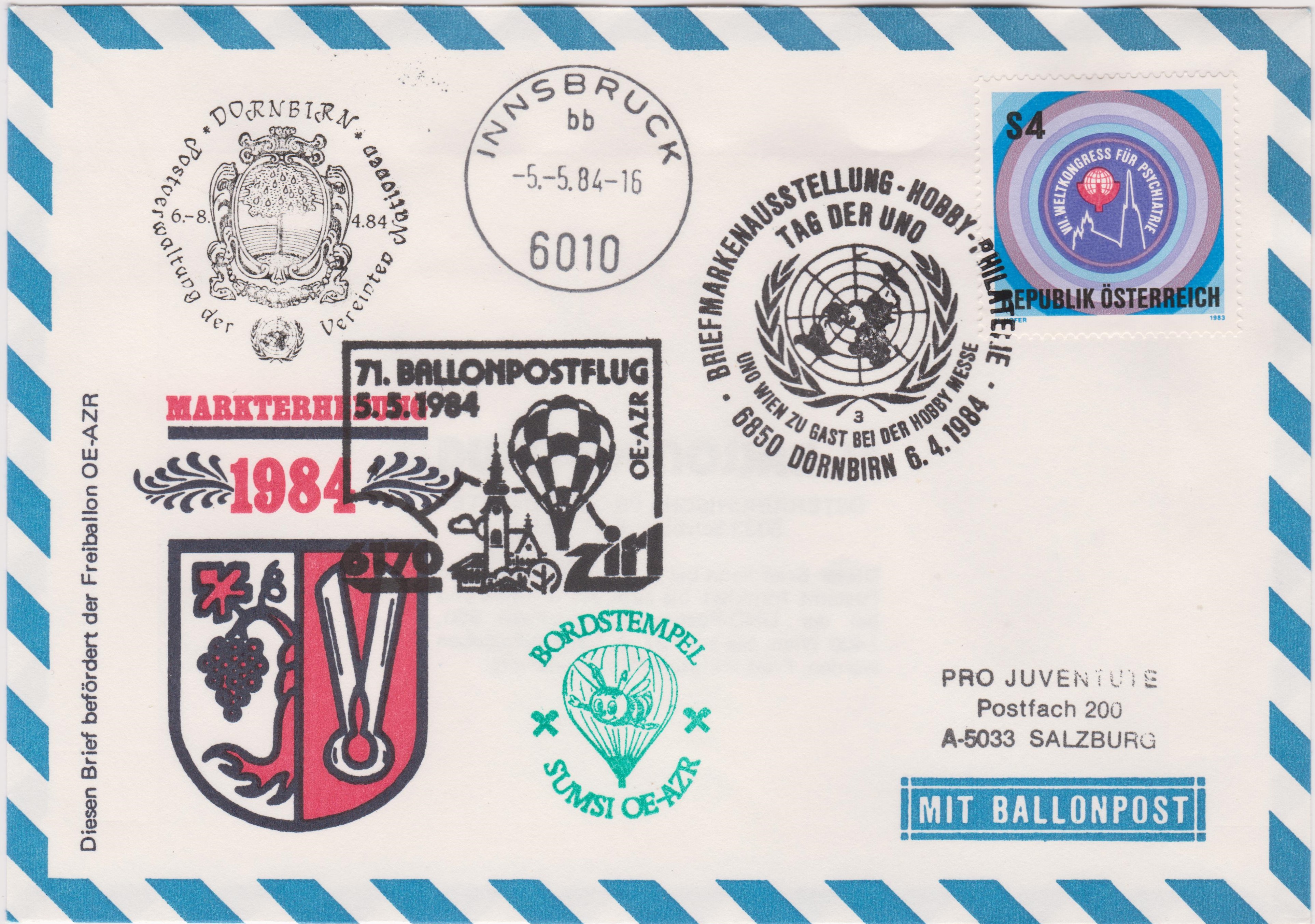 Dann wurde der Beleg am 05.05.1984 mit dem Ballon "SUMSI OE-AZB" befördert von 6170 ZIRL nach 6010 INNSBRUCK, wo er um 16 Uhr der österreichischen Post übergeben wurde zur Weiterbeförderung an seinen Bestimmungsort Salzburg.