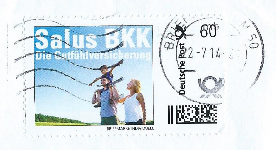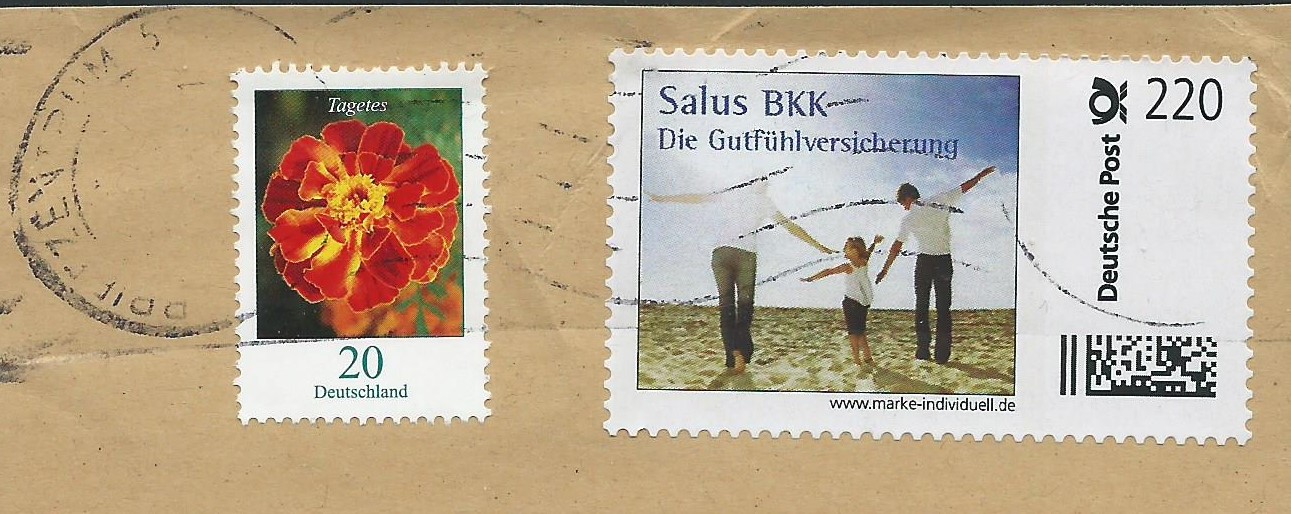 Und als letzte Marke meines Bestandes die Wertstufe 220 ct. Hier ist ein Wellenstempel vom Briefzentrum 50 erkennbar, allerdings ohne lesbares Datum. Da noch eine 20 ct Blume daneben klebt, gehe ich von Verwendung in 2014 aus, da ja der Maxi-Brief seit 1.1.14 240 ct kostet.