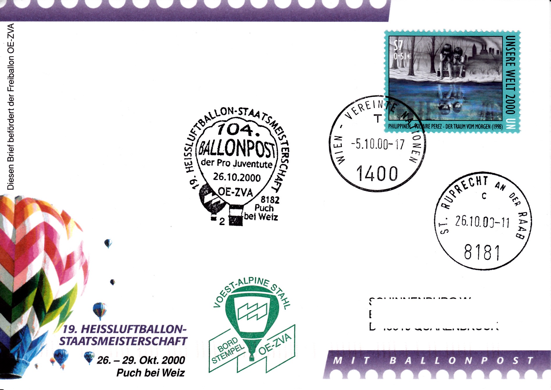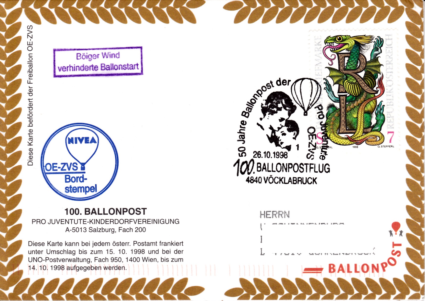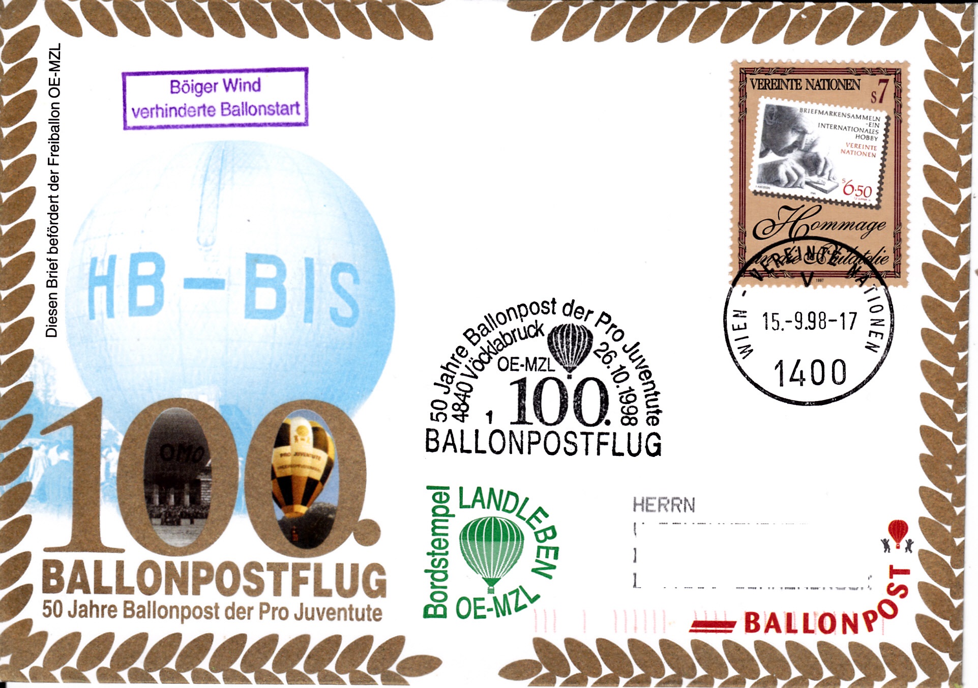 Dieser Umschlag wurde am 26.10.1998 in Vöcklabruck für den 100. Ballonpostflug der Österreichischen Pro Juventute mit dem Freiballon HB-MZL aufgegeben. Er erhielt den Sonderstempel mit der Kennziffer "1" aus Vöcklabruck zu diesem Ballonflug. Wegen Schlechtwetter konnte der Ballon jedoch nicht starten. Er erhielt daher zusätzlich einen Bordstempel und einen Ausfallstempel.
