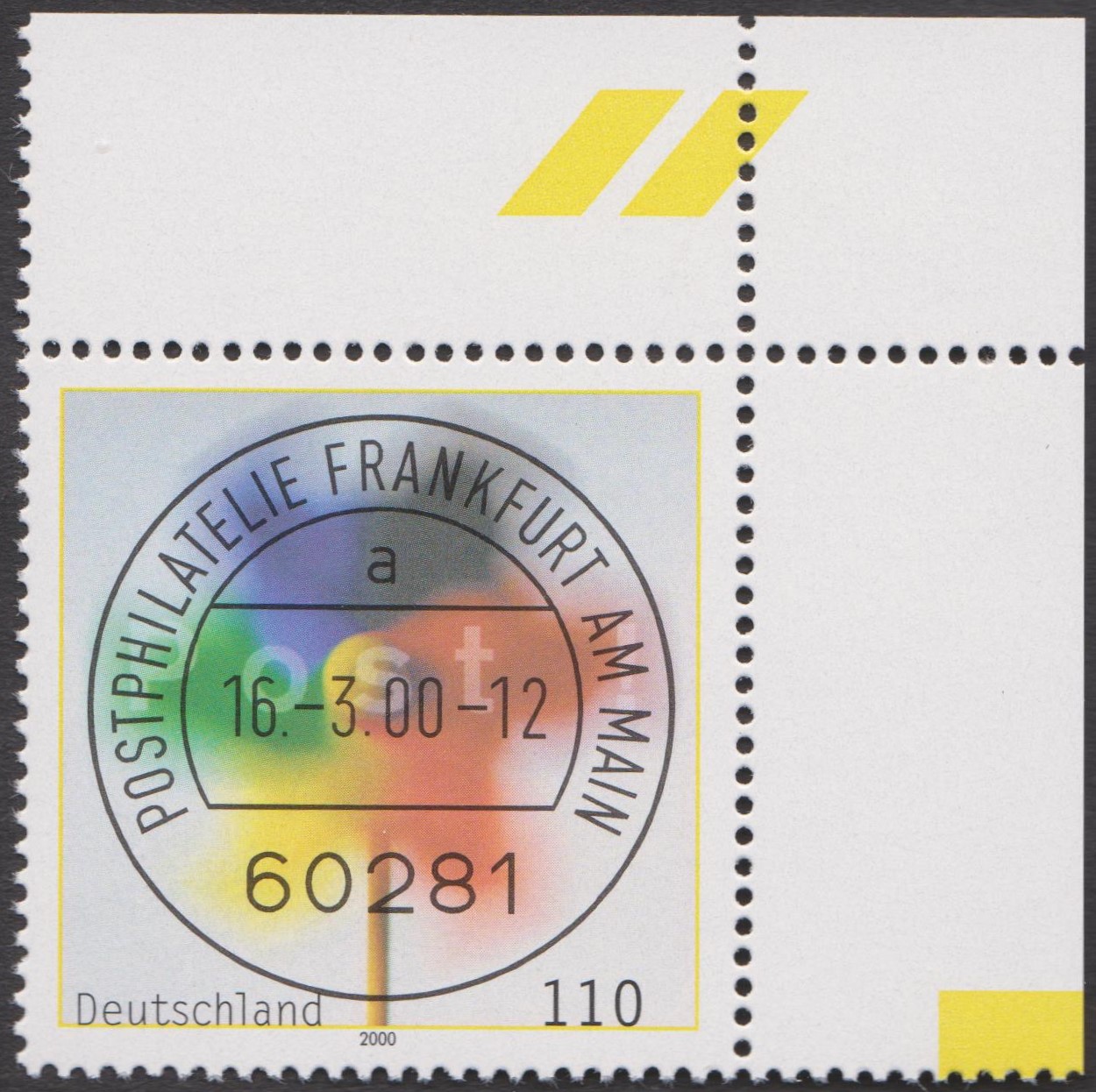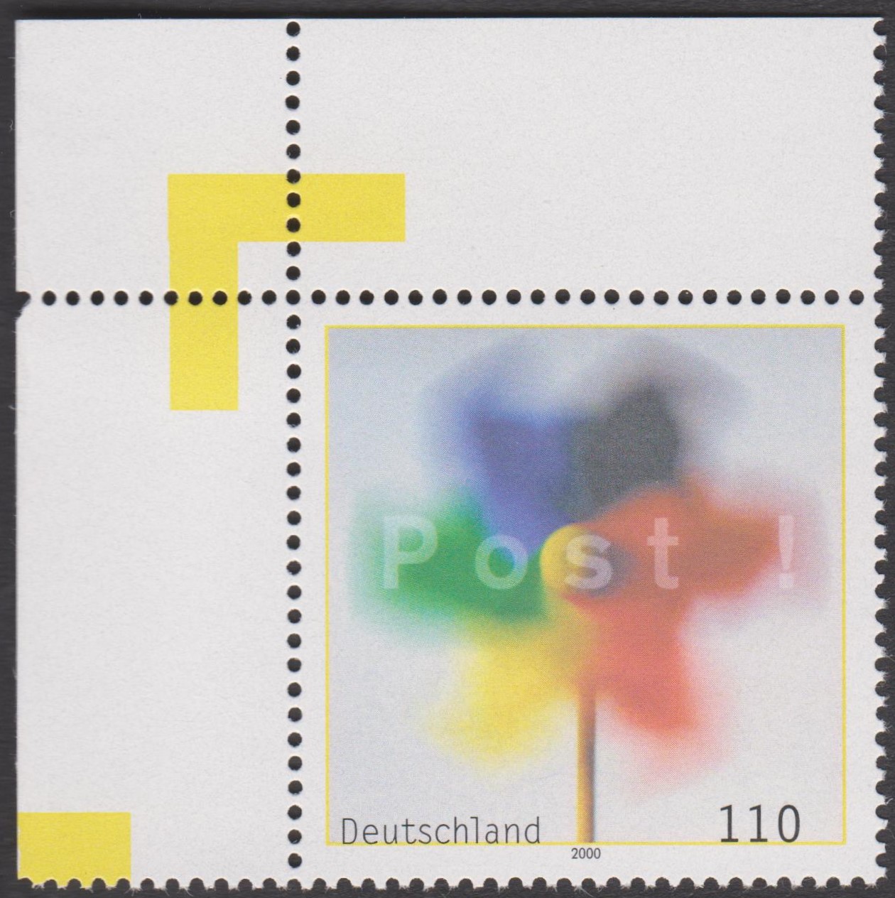 Mit diesem am 16.03.2000 erschienen Postwertzeichen "Post !", MiNr. 2106, mit der Darstellung eines Windrades, hier auf ETB 17/2000, begann eine Serie von Sondermarken mit Posteigenwerbung: