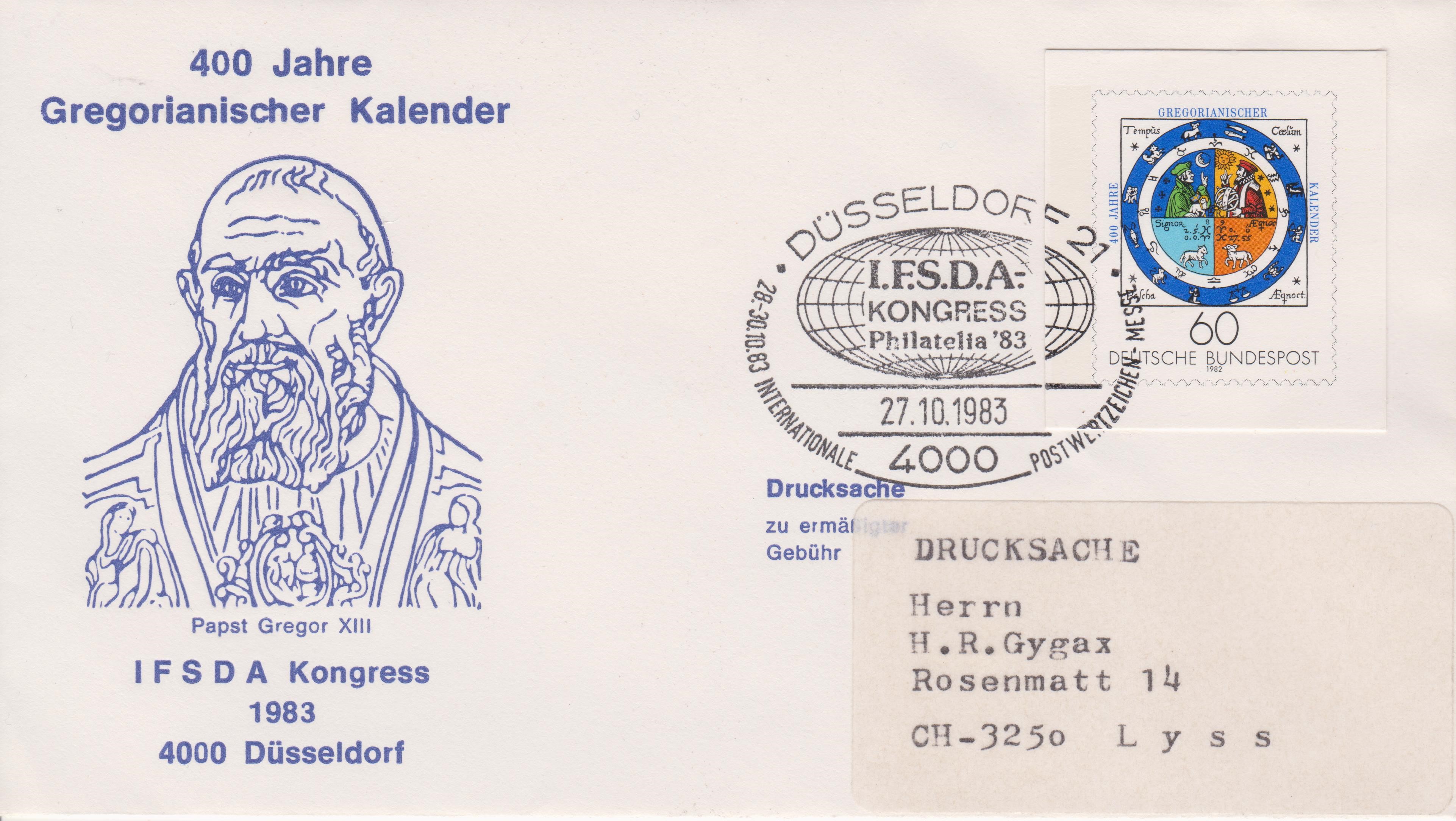 Anfangen möchte ich mit diesem Ausschnitt aus einer Ganzsache Bund PSo 9 aus der "Sonderpostkarte IFSDA-Kongress in Düsseldorf" mit Eindruck der Bund MiNr. 1155 "400 Jahre Gregorianischer Kalender", gelaufen am 27.10.1983 (= Erstausgabetag der Ganzsache Bund PSo 9) auf einer "Drucksache" in die Schweiz: