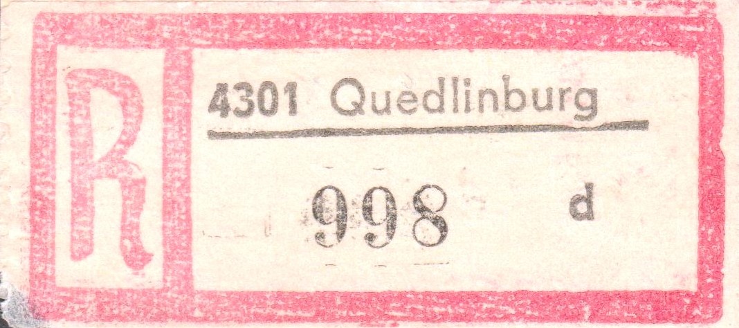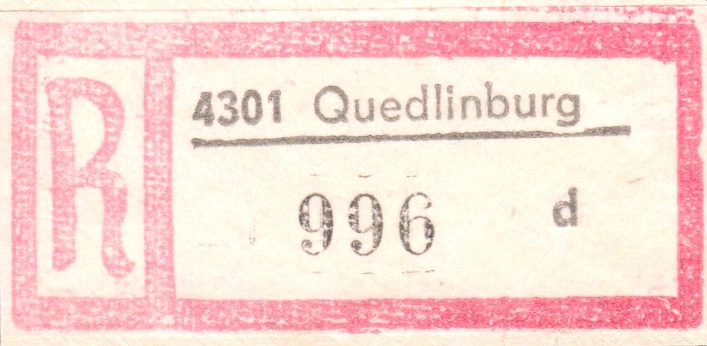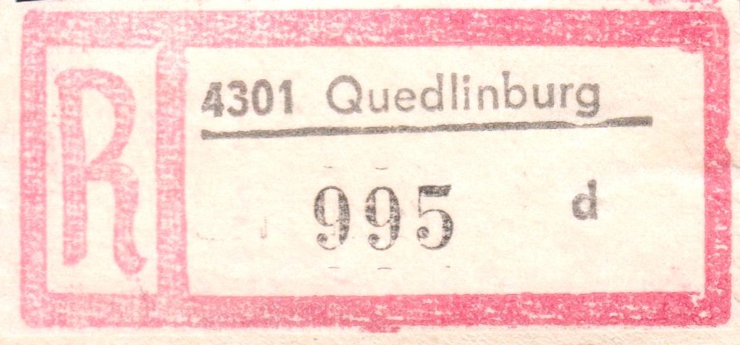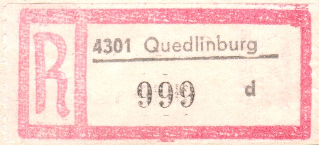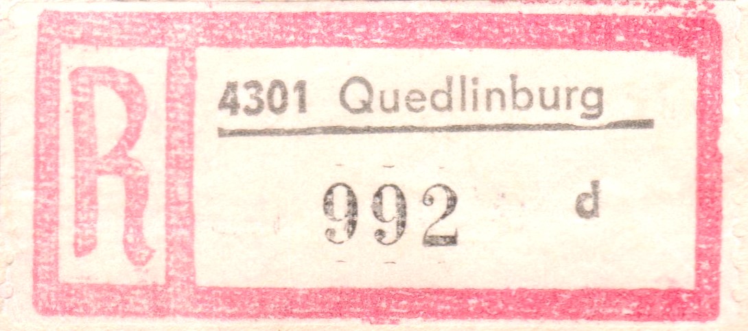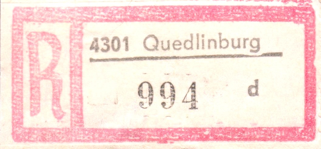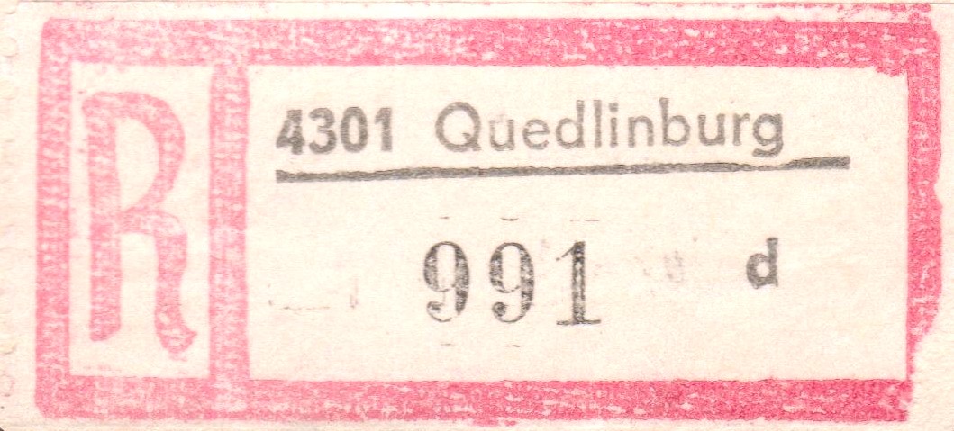 Einschreibzettel aus 4301 Quedlinburg, gedruckt auf Pergamin-Papier: