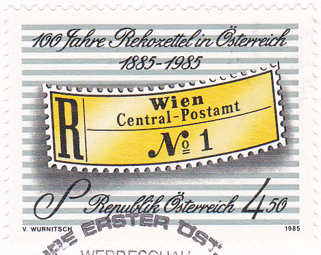 Zum Jubiläum "100 Jahre Rekozettel in Österreich" ist in Österreich diese Marke (MiNr 1806) diese Marke mit der Abbildung eines Einschreibzettel aus dem Jahre 1885 erschienen.