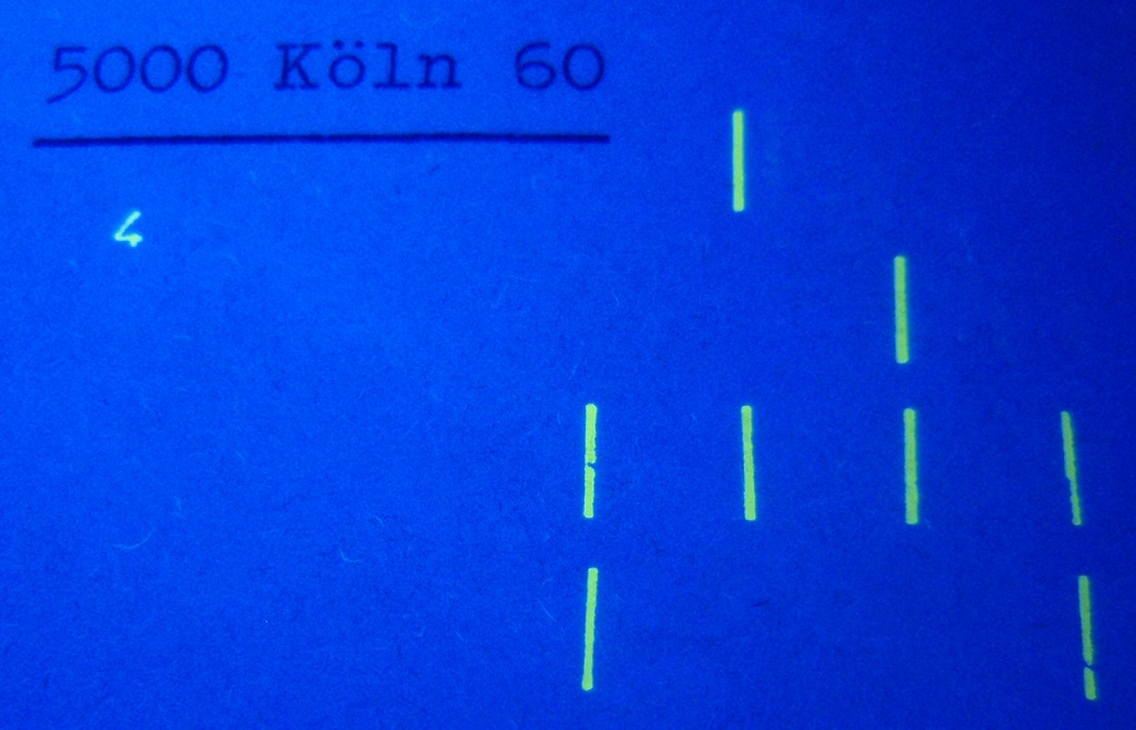 Wie könnte ich diesen folgenden Beleg (von Berlin nach Köln) so herrichten, dass die 4 (der Codierplatz) und die 4zeilige sowie 4-spaltige Codierung sichtbar ist? Die Codierung hat fast die Farbe des Papiers. Da sieht man im Moment wirklich nichts.
