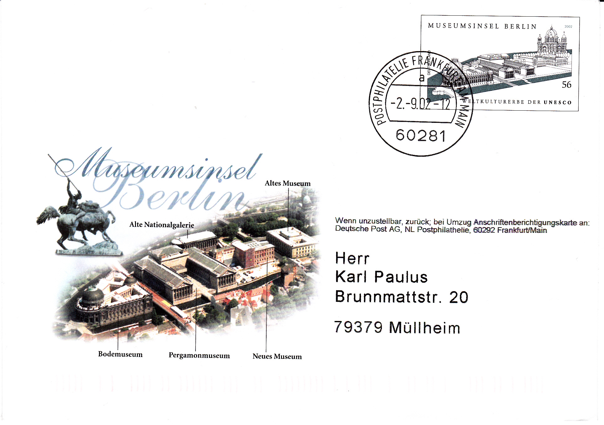 Ganzsachenumschlag (USo 41 Y) mit Wertstempel Museums-Insel Berlin (MiNr 2274) mit Vorausentwertung "POSTPHILATELIE FRANKFURT AM MAIN / A / -2.-9.02-12 / 60281" als Posteigenausgabe (MiNr EA A9). Die Ganzsache enthielt eine "Persönliche Mitteilung" zur Einführung des Euro auf deutschen Briefmarken, eine Klappkarte und ein Werbeblatt.