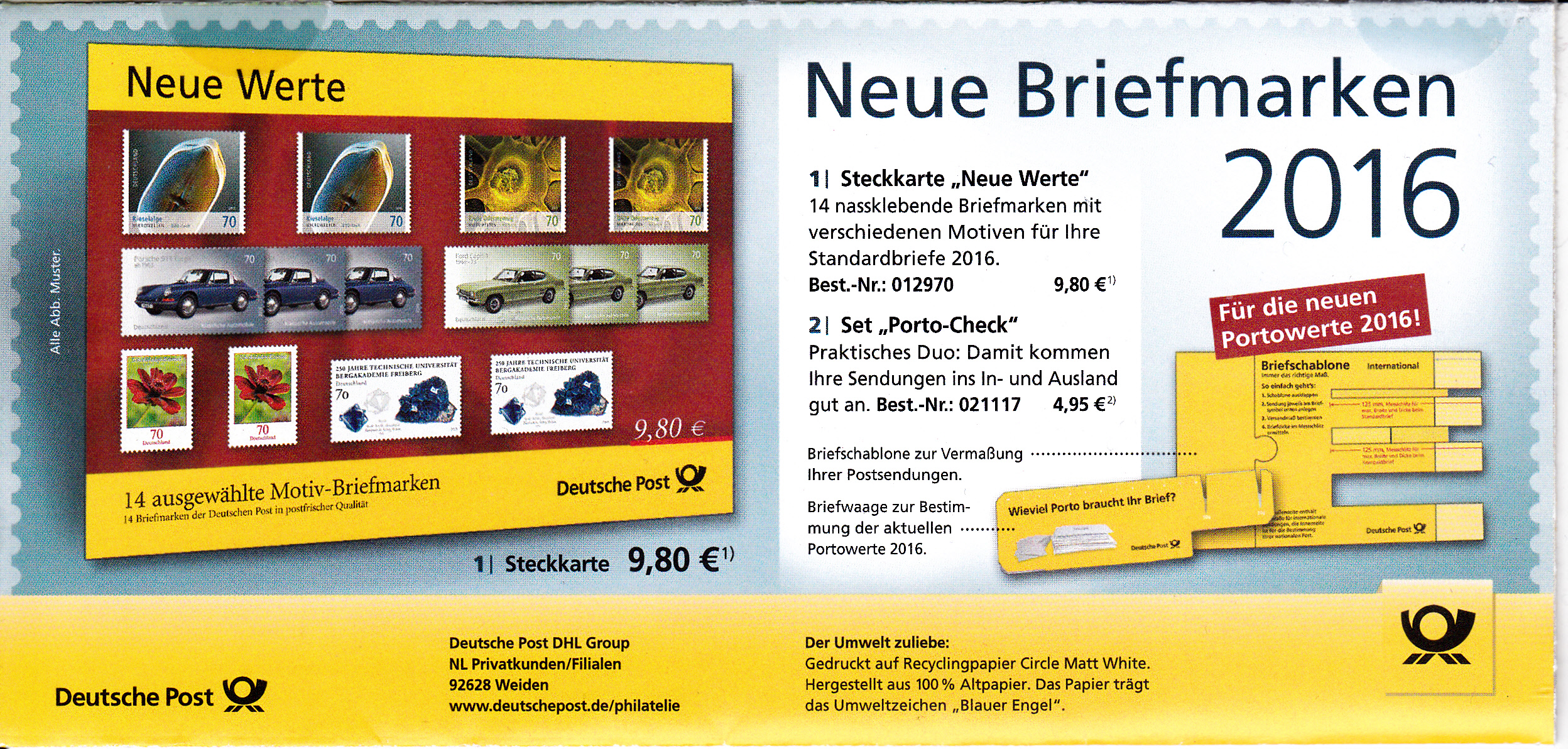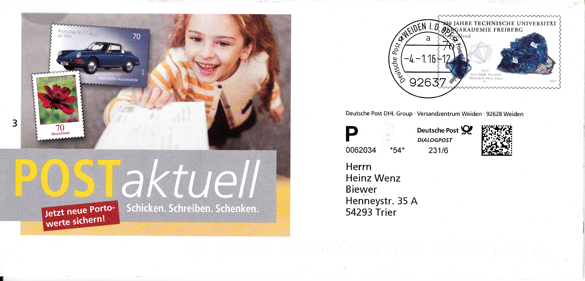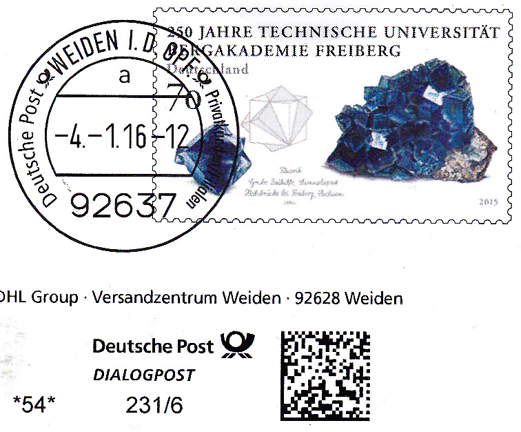 Faltbrief 212 mm x 102 mm mit Wertstempel "250 Jahre Technische Universität Bergakademie Freiberg" (MiNr 3194) mit aufgedruckter Zähnung und Vorausentwertung "Deutsche Post (Posthorn) WEIDEN I.D.OPF (Posthorn) Privatkunden/Filialen / a / -4.-1.16-12". Gegenüber früheren Sendungen wird unterhalb des Eindrucks "Deutsche Post" erstmals der Begriff "DIALOGPOST" anstatt "INFOPOST" benutzt.
