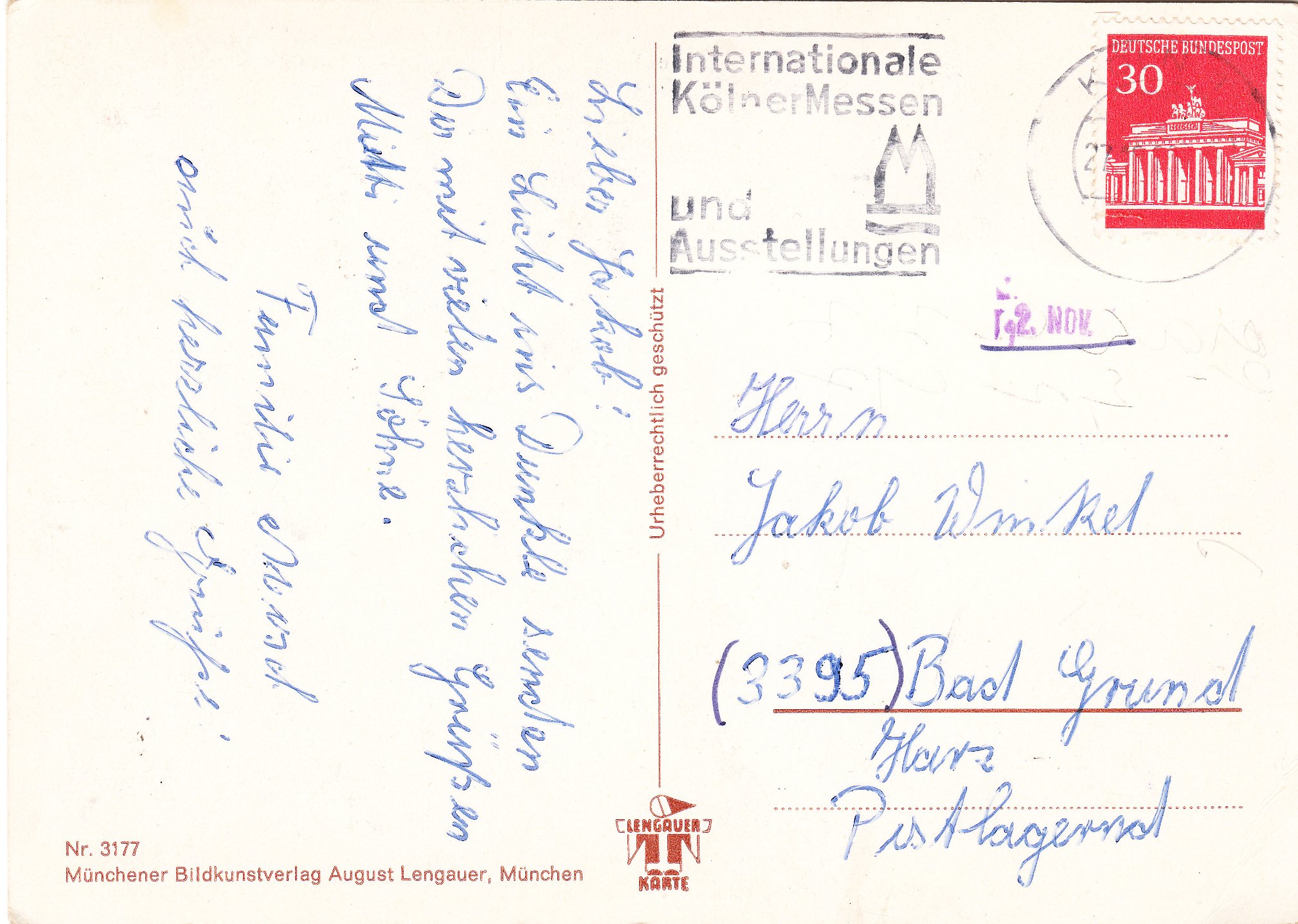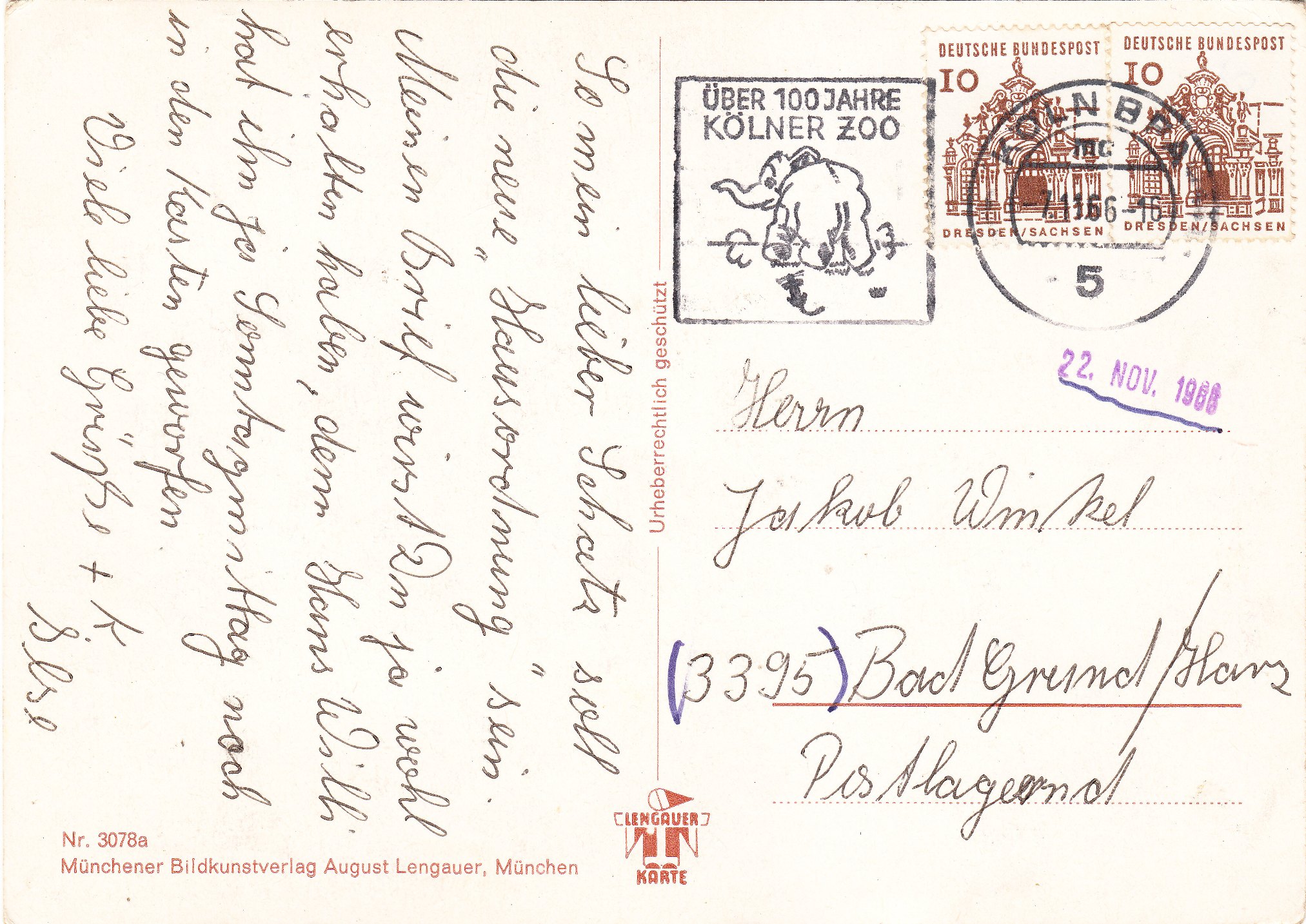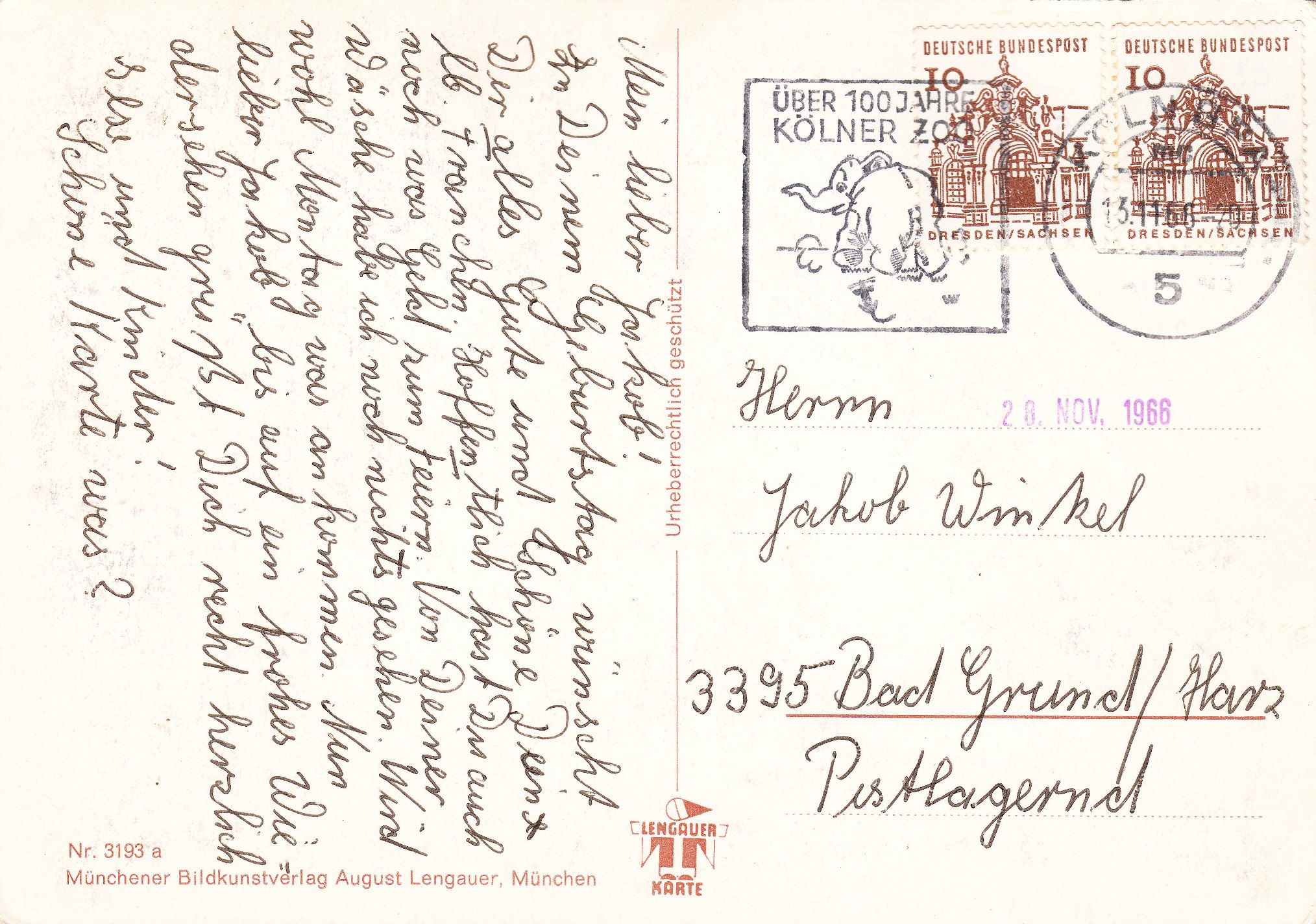 Diese am 07.11.1966 in Köln aufgegebene Postkarte wurde adressiert an "Herrn Jakob Winkel 3395 Bad Grund/Harz Postlagernd".