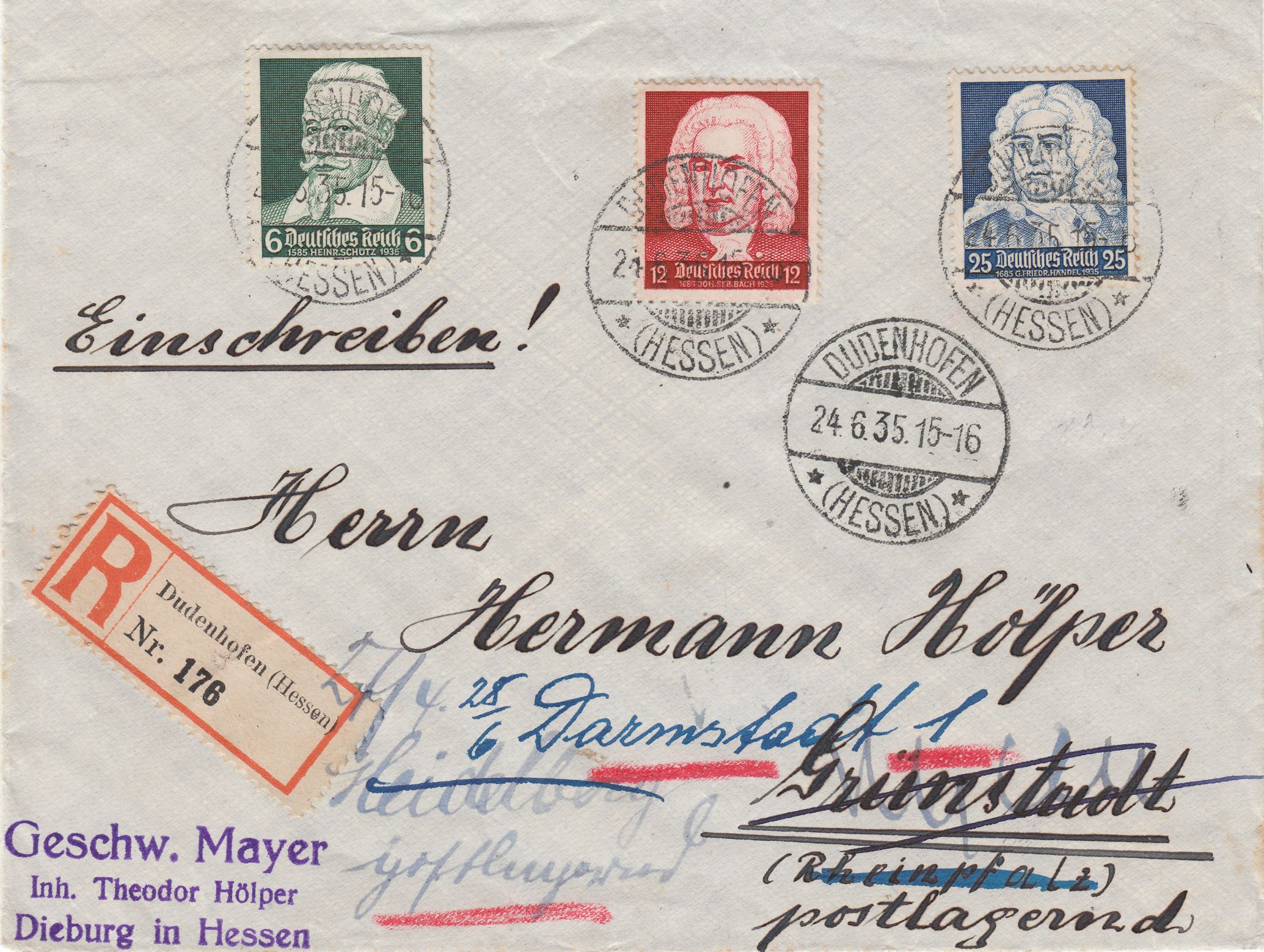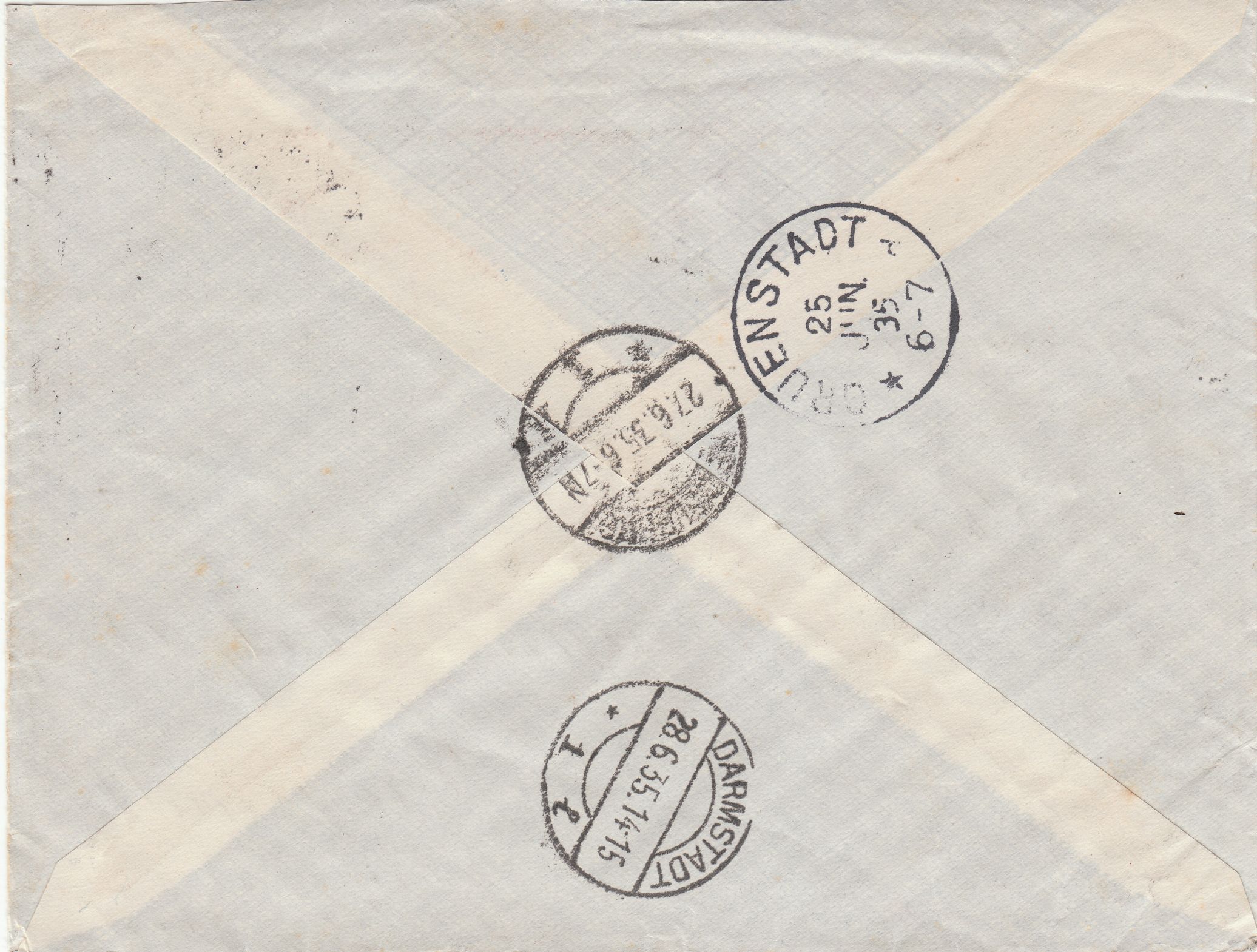 Und in Heidelberg wiederhote sich dieselbe Prozedur, wobei der Brief wiederum direkt am 28.06.1935 nach Darmstadt weitergeleitet wurde, wo er laut rückseitigem Ankunftsstempel am 28.06.1935 um "14-15" Uhr nachmittags ankam.