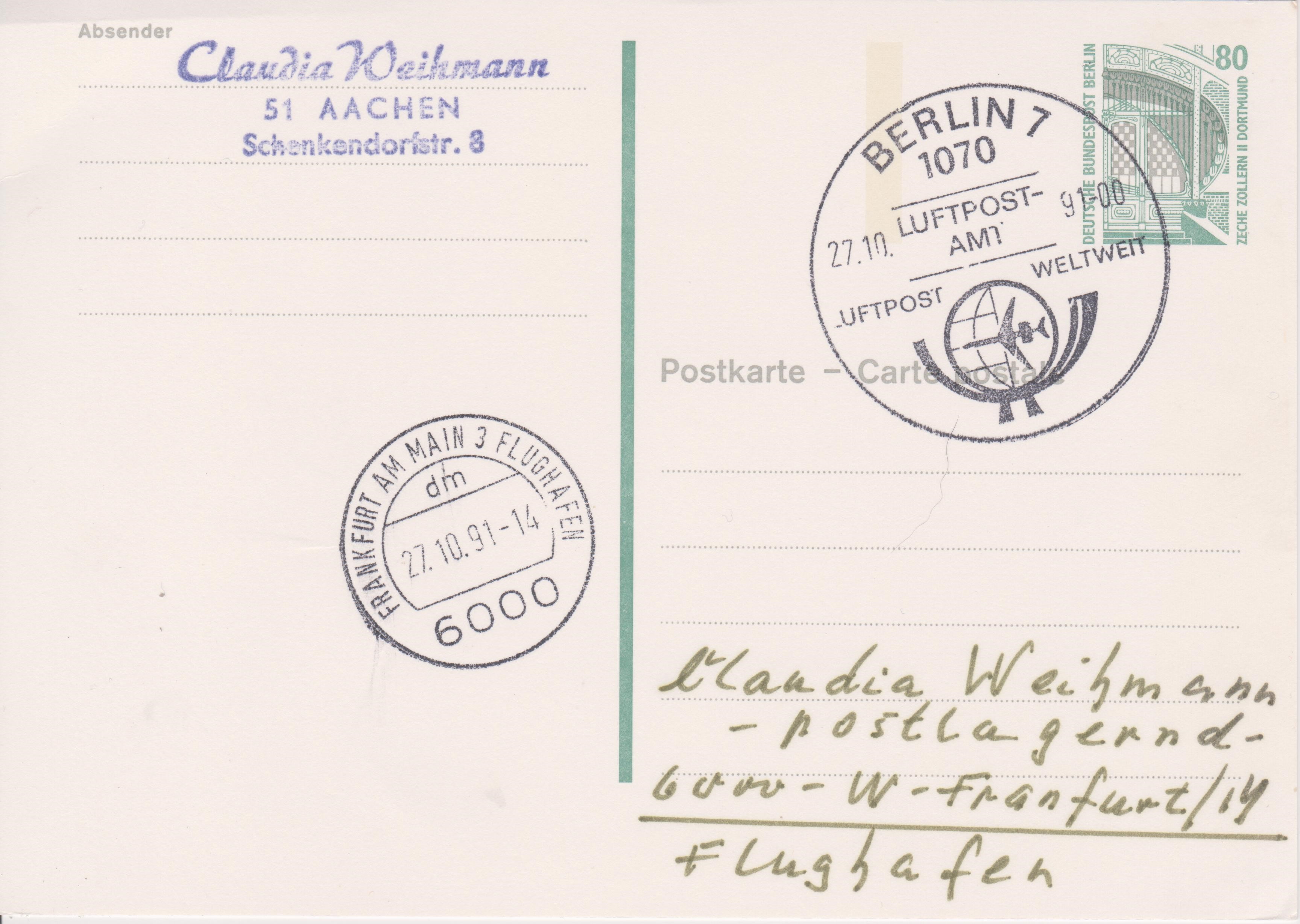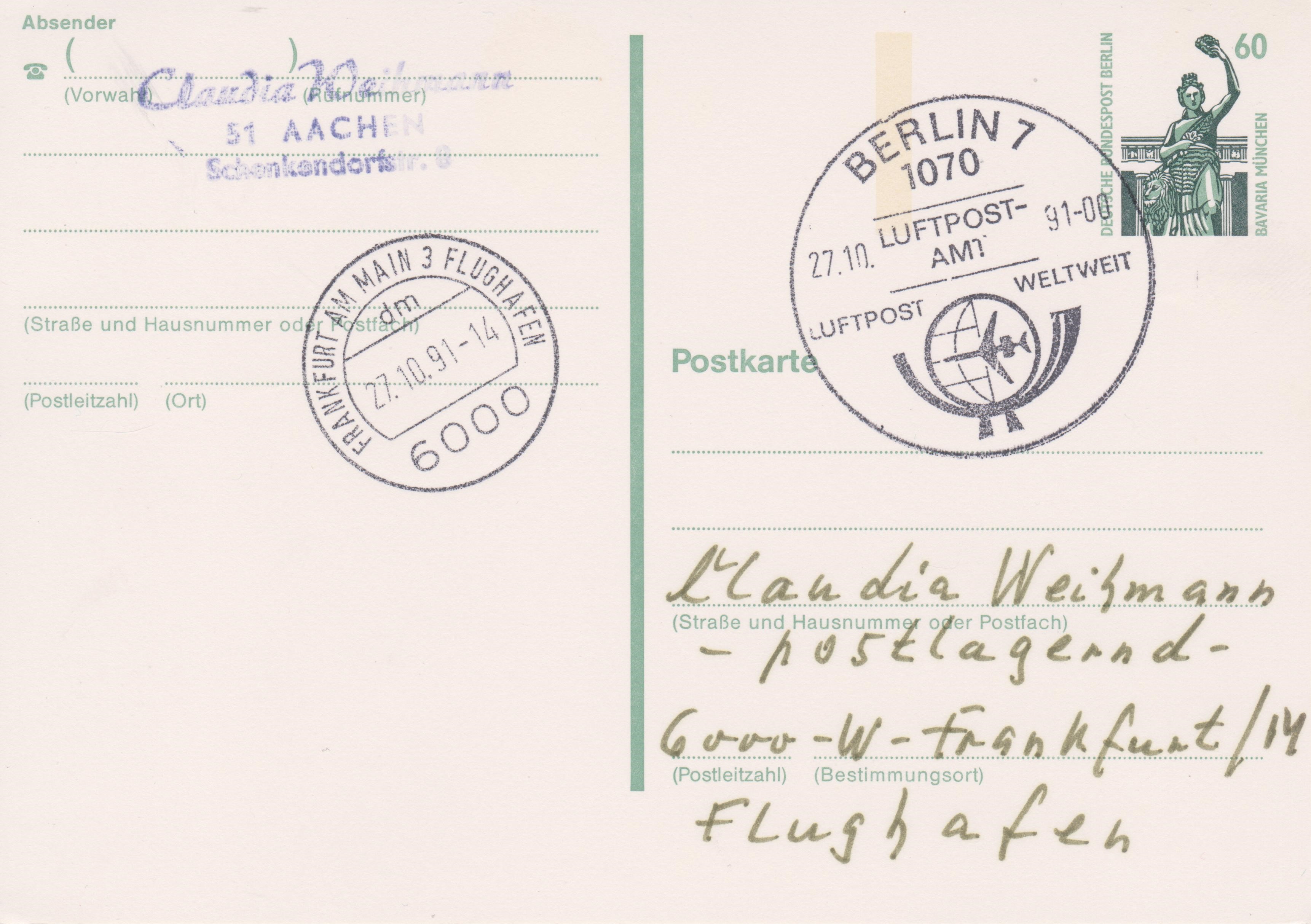 Beide sind adressiert nach "6000-W-Frankfurt/M Flughafen", wo diese Sendungen noch am selben Tag ankamen, was ein Tagesstempel 6000 FRANKFURT AM MAIN 3 FLUGHAFEN 27.10.91-14 dokumentiert: