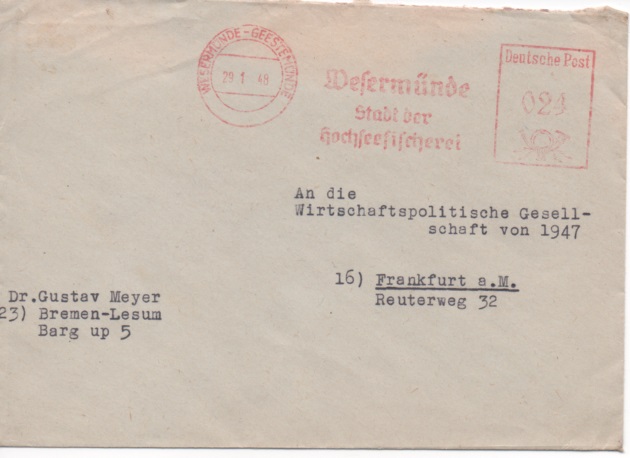 Wesermünde und das Motiv der verwendeten Briefmarken belegen die Zeit vor dem Ende des Zweiten Weltkriegs. Trotzdem lauten sowohl Stempel als auch Paketaufkleber auf