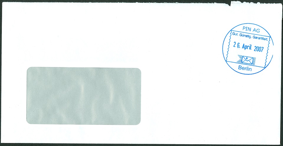Obwohl dieser private Postdienstleister eigene Briefmarken editiert, kommen auch Poststücke ohne vor. Hier ein schönen "Rund"Stempel aus dem Jahr 2007.