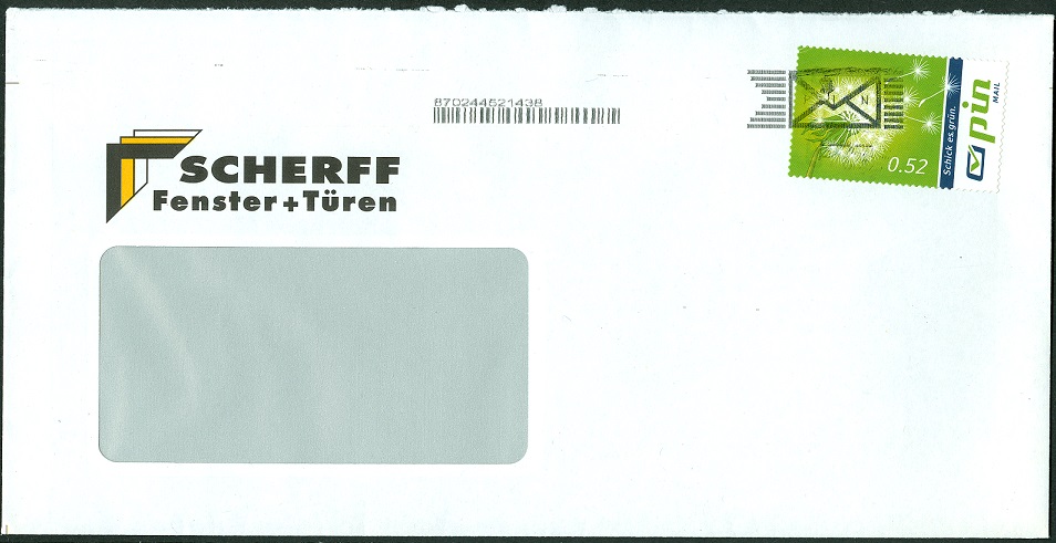 Dieses als EF auf einem Fensterbrief verwendete Exemplar der MiNr. 42 vom Oberrand, der Wert zu 48 Cents aus dem am 27.08.2004 erschienenen Satz von 5 Werten, wurde am 08.11.2004 im PIN Shop Potsdamer Straße in 10785 Berlin entwertet: