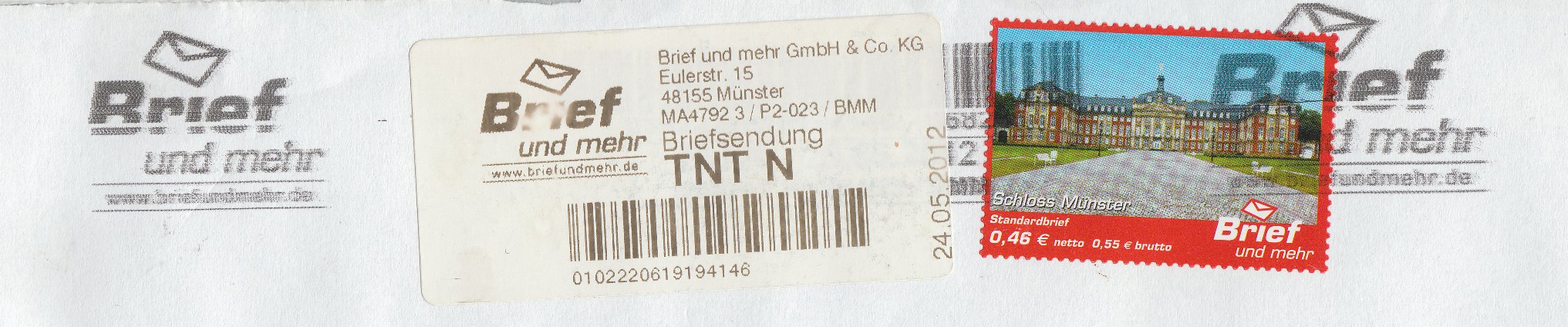 Dieses Briefstück zeigt die Ausgabe zu 0,46 € für einen Standardbrief des in Münster ansässigen Dienstleisters "Brief und mehr" mit dem Motiv "Schloss Münster" sowie ein Bearbeitungslabel: