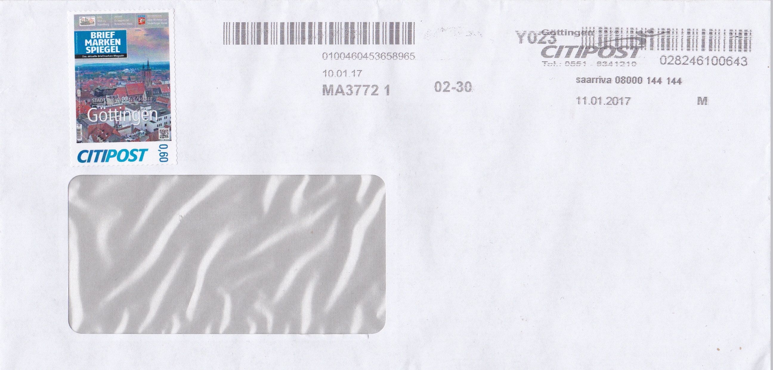 Der Brief wurde am 10.01.2017 in Göttingen bei der CITIPOST aufgegeben. AM 11.01.2017 wurde er von saariva übernommen, deren Zustellgebiet das Saarland und die Region Trier/Mosel/Eifel umfasst.