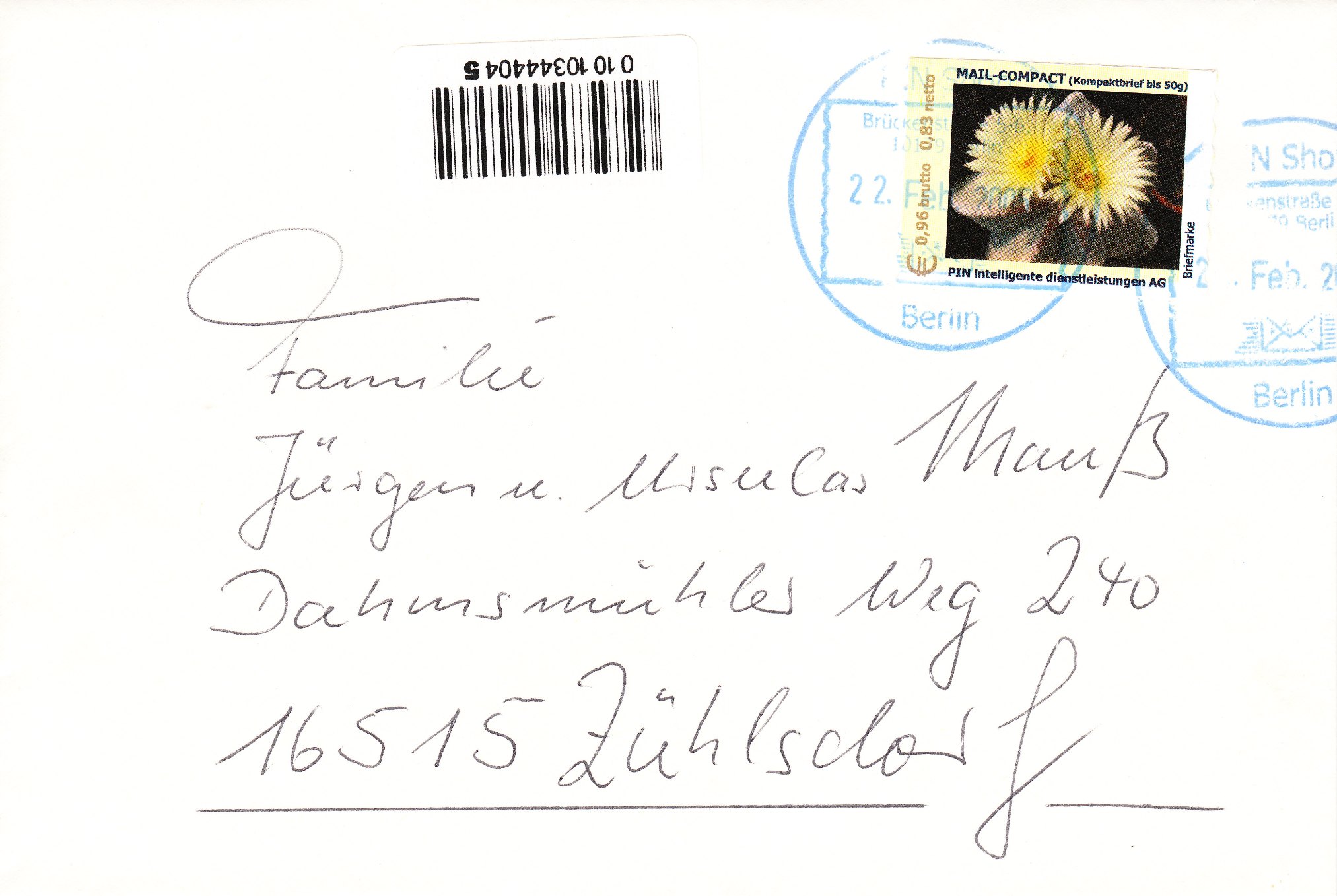 Hier ein Beleg vom 22.02.2005 mit einer EF des am 05.04.2004 im Rahmen des aus insgesamt 5 Werten bestehenden Satzes "Botanischer Garten" von PIN Mail Berlin ausgegebenen Wertes zu 0,96 €, MiNr. 38: