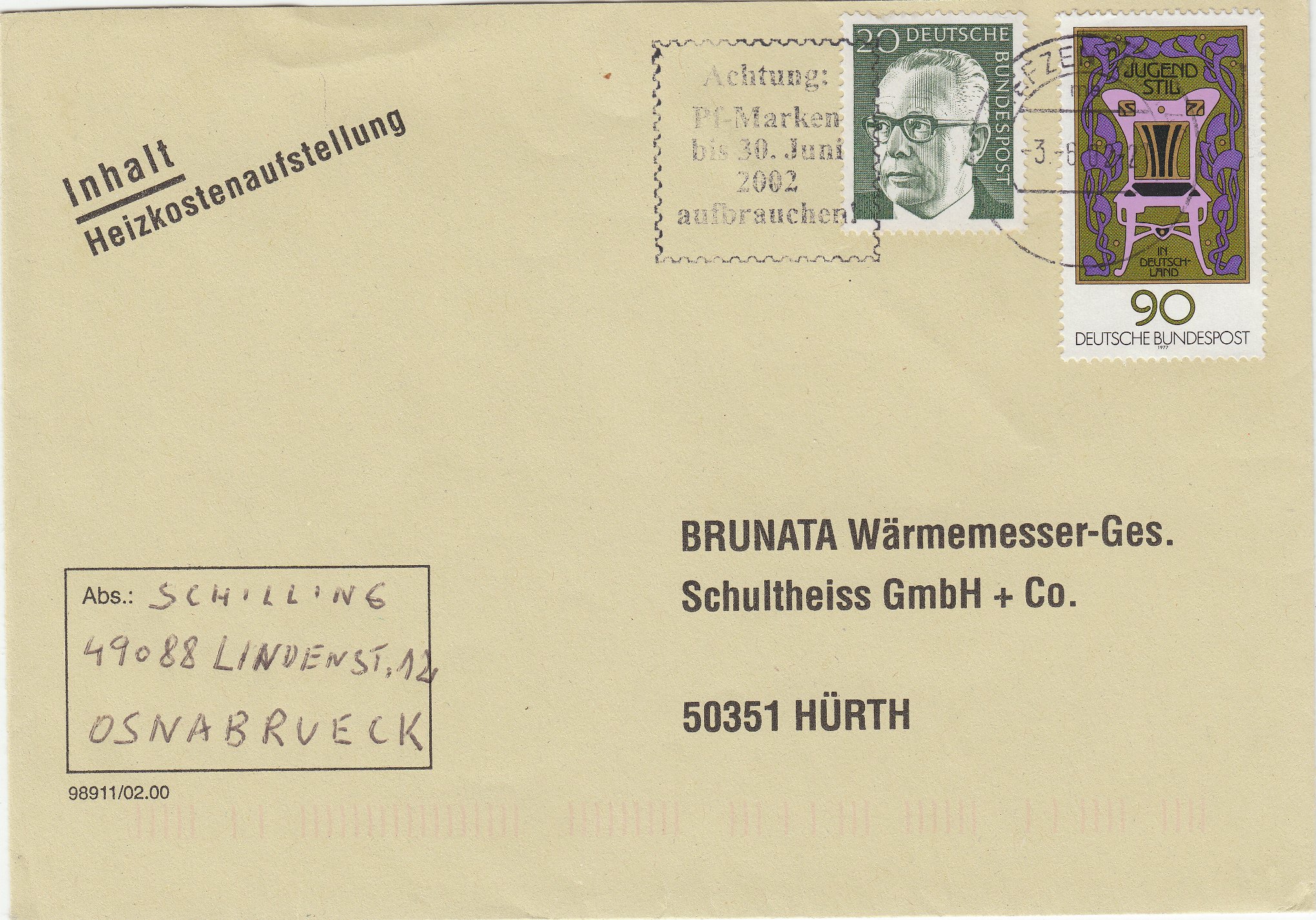 Hier ein Standardbrief (110 Pf) vom 03.06.2002, der im Briefzentrum 49 einen Maschinenstempel mit Werbeeinsatz "Achtung: Pf-Marken bis 30. Juni 2002 aufbrauchen!" bekam: