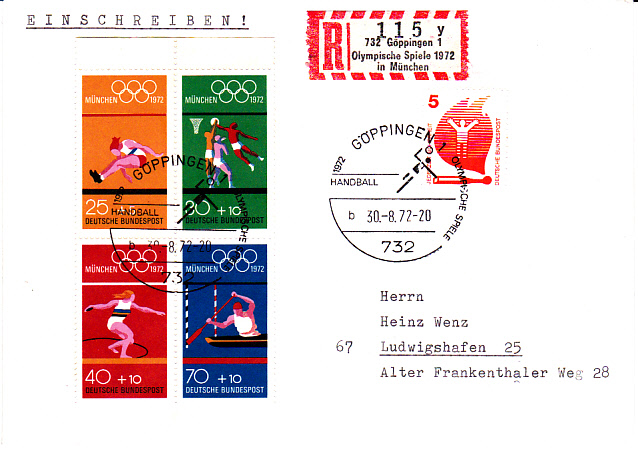 Einschreibebrief von Göppingen nach Ludwigshafen mit einem Sonder-R-Zettel " 732 Göppingen 1 Olympische Spiele 1972 in München" und einem dazu passenden Sonderstempel aus Göppingen vom 30.8.1972 zum Olympischen Handballturnier.