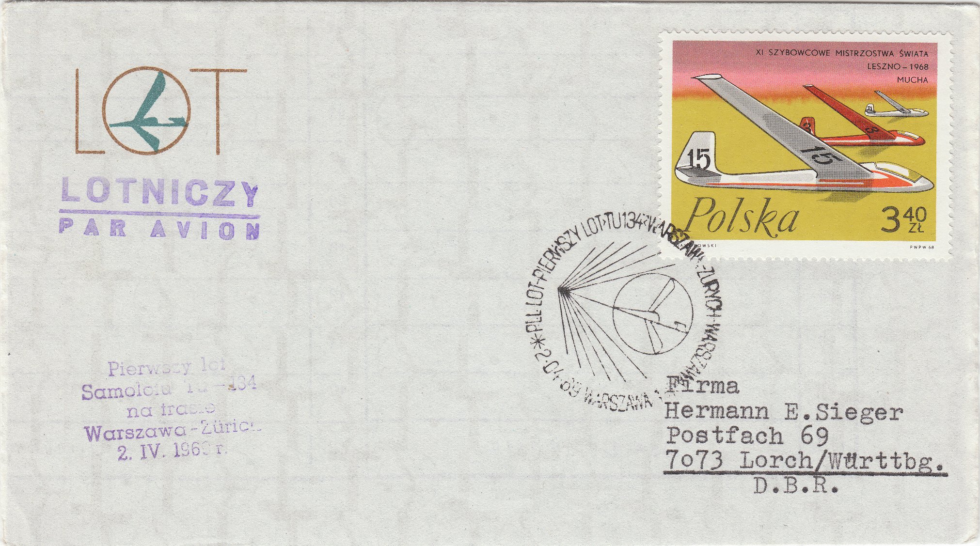 Einzelfrankatur des Wertes zu 3,40 Zloty, erschienen in Polen zur Weltmeisterschaft 1968 mit der Darstellung von drei Segelflugzeugen von insgesamt 105, die bei dieser WM starteten: