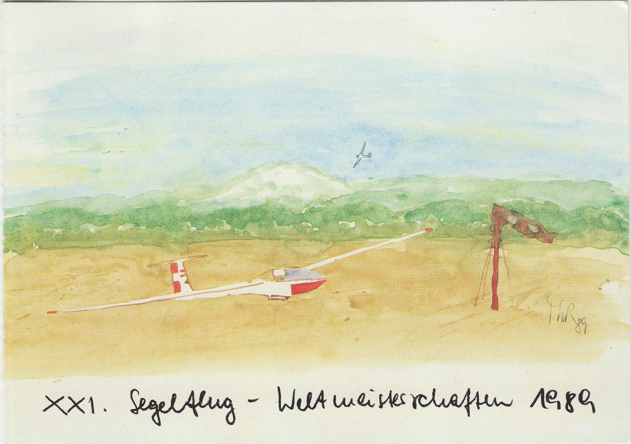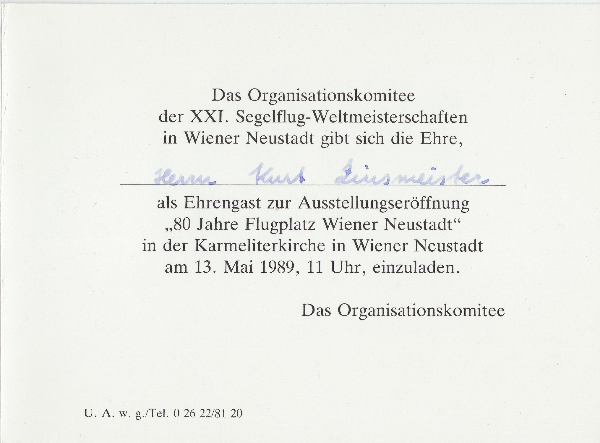 Mit dieser Klappkarte lud das Organisationskomitee der XXI. Segelflug-Weltmeisterschaften für den 13.05.1989 namentlich zur Ausstellungseröffnung "80 Jahre Flugplatz Wiener Neustadt" in die Karmeliterkirche in Wiener Neustadt ein: