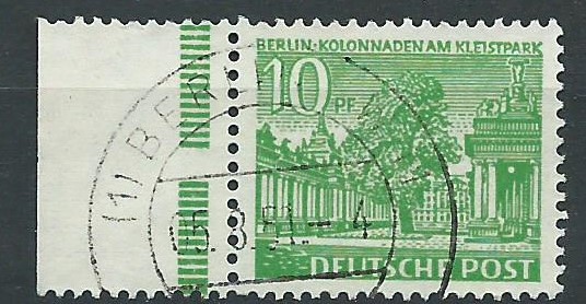 Hier einmal eine gestempelte lose Marke vom Unterrand. Auffällig ist die Unterbrechung der Strichelleiste. Normalerweise sind die Strichelleisten durchgehend, es sind aber von verschiedenen Marken im Plattendruck sowohl von Bund als auch Berlin Unterbrechungen bekannt. Daran kann man einzelne Teilauflagen bestimmen, sofern man komplette Bogen als Abbildung vorliegen hat.